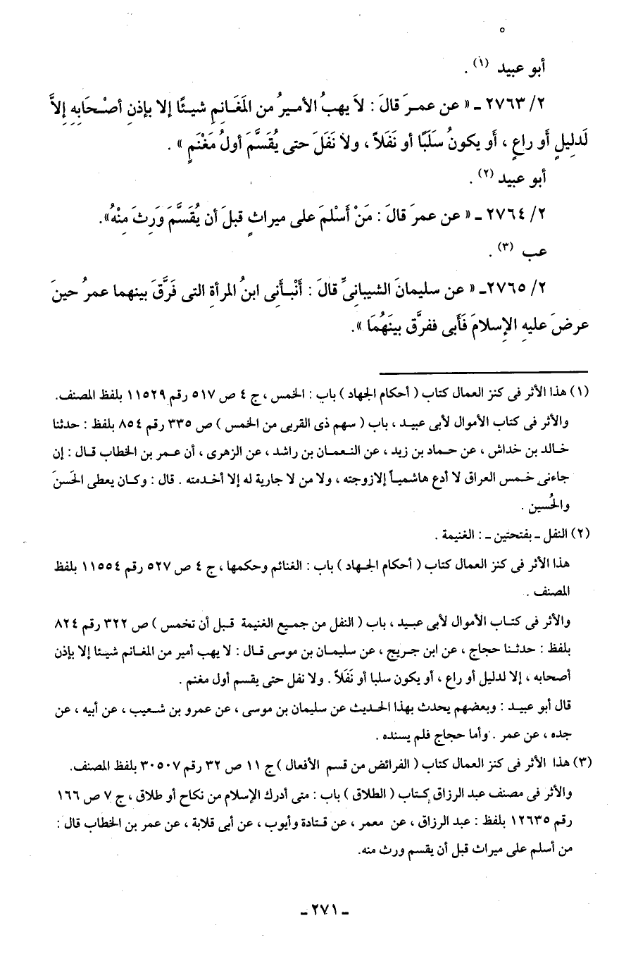 2/ 2763 - "عن عمرَ قالَ: لَا يهبُ الأميرُ من المَغَانِم شيئًا إلا بإذنِ أصْحَابِهِ إِلَّا لَدلِيلٍ أو راعٍ، أَو يكونُ سَلَبًا أو نَفَلًا، ولا نَفَلَ حتى يُقَسَّمَ أولُ مَغْنَمٍ".