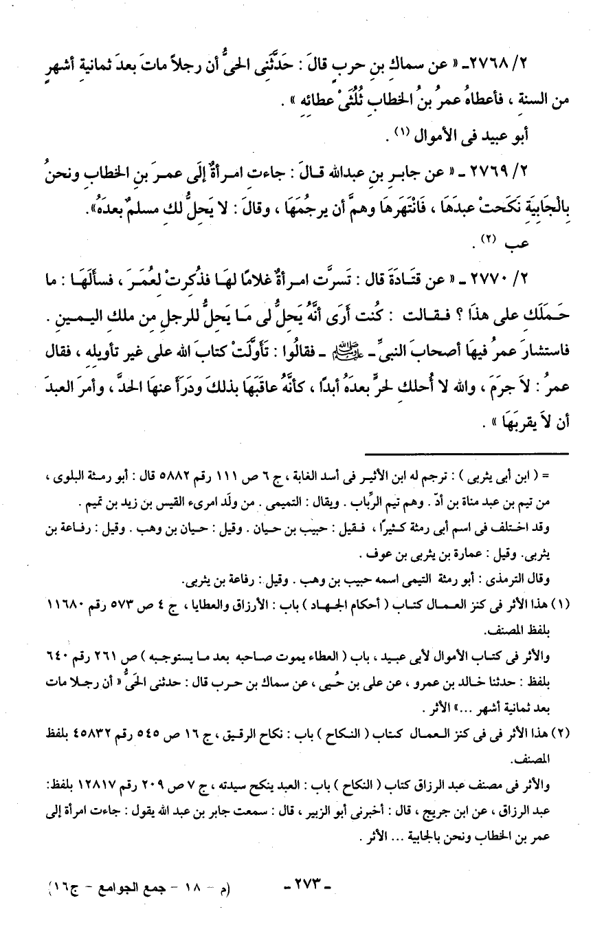 (¬2) هذا الأثر في في كنز العمال كتاب (النكاح) باب: نكاح الرقيق، جـ 16 ص 545 رقم 45832 بلفظ المصنف.
