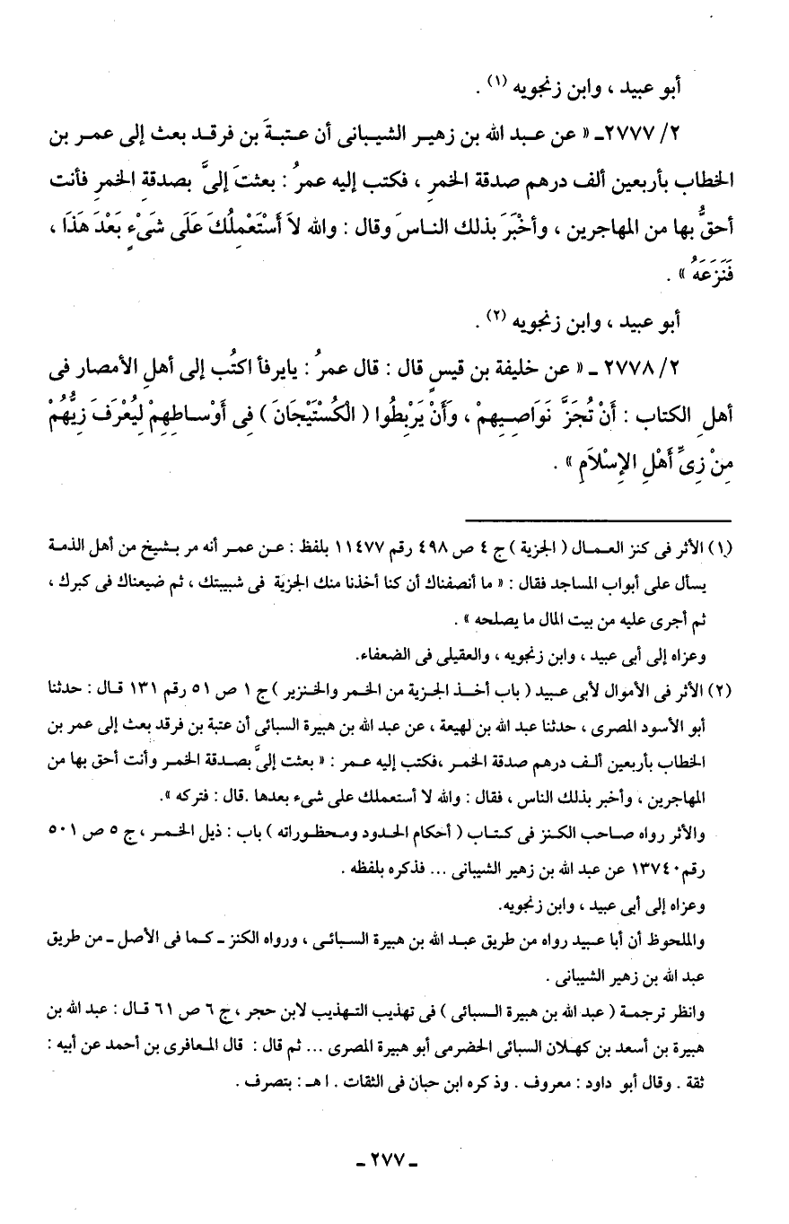 (¬2) الأثر في الأموال لأبى عبيد (باب أخذ الجزية من الخمر والخنزير) جـ 1 ص 51 رقم 131 قال: حدثنا أبو الأسود المصرى، حدثنا عبد اللَّه بن لهيعة، عن عبد اللَّه بن هبيرة السبائى أن عتبة بن فرقد بعث إلى عمر بن الخطاب بأربعين ألف درهم صدقة الخمر، فكتب إليه عمر: "بعثت إلى بصدقة الخمر وأنت أحق بها من المهاجرين، وأخبر بذلك الناس، فقال: واللَّه لا أستعملك على شئ بعدها. قال: فتركه". والأثر رواه صاحب الكنز في كتاب (أحكام الحدود ومحظوراته) باب: ذيل الخمر، جـ 5 ص 501 رقم 13740 عن عبد اللَّه بن زهير الشيبانى. . . فذكره بلفظه.