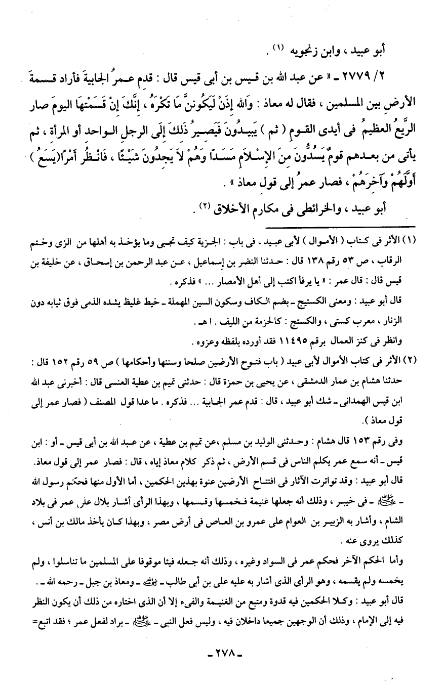 2/ 2779 - "عن عبد اللَّه بن قيس بن أَبى قيس قال: قدِم عمرُ الجابيةَ فأراد قسمةَ الأَرْضِ بين المسلمين، فقال له معاذ: وَاللَّه إِذَنْ لَيَكُوننَّ مَا تَكْرَهُ، إِنَّكَ إِنْ قَسَمْتهَا اليومَ صار الرِّيعُ العظيمُ في أيدى القوم (ثم) يَبيدُونَ فَيَصِيرُ ذَلِكَ إِلَى الرجلِ الواحدِ أو المرأةِ، ثم يأتى من بعدهم قومٌ يَسُدُّونَ مِنَ الإِسْلَامِ مَسَدًّا وَهُمْ لَا يَجِدُونَ شَيْئًا، فَانْظُر أَمْرًا (يَسَعُ) أوَّلهُمْ وآخِرَهُمْ، فصار عمرُ إلى قولِ معاذ".