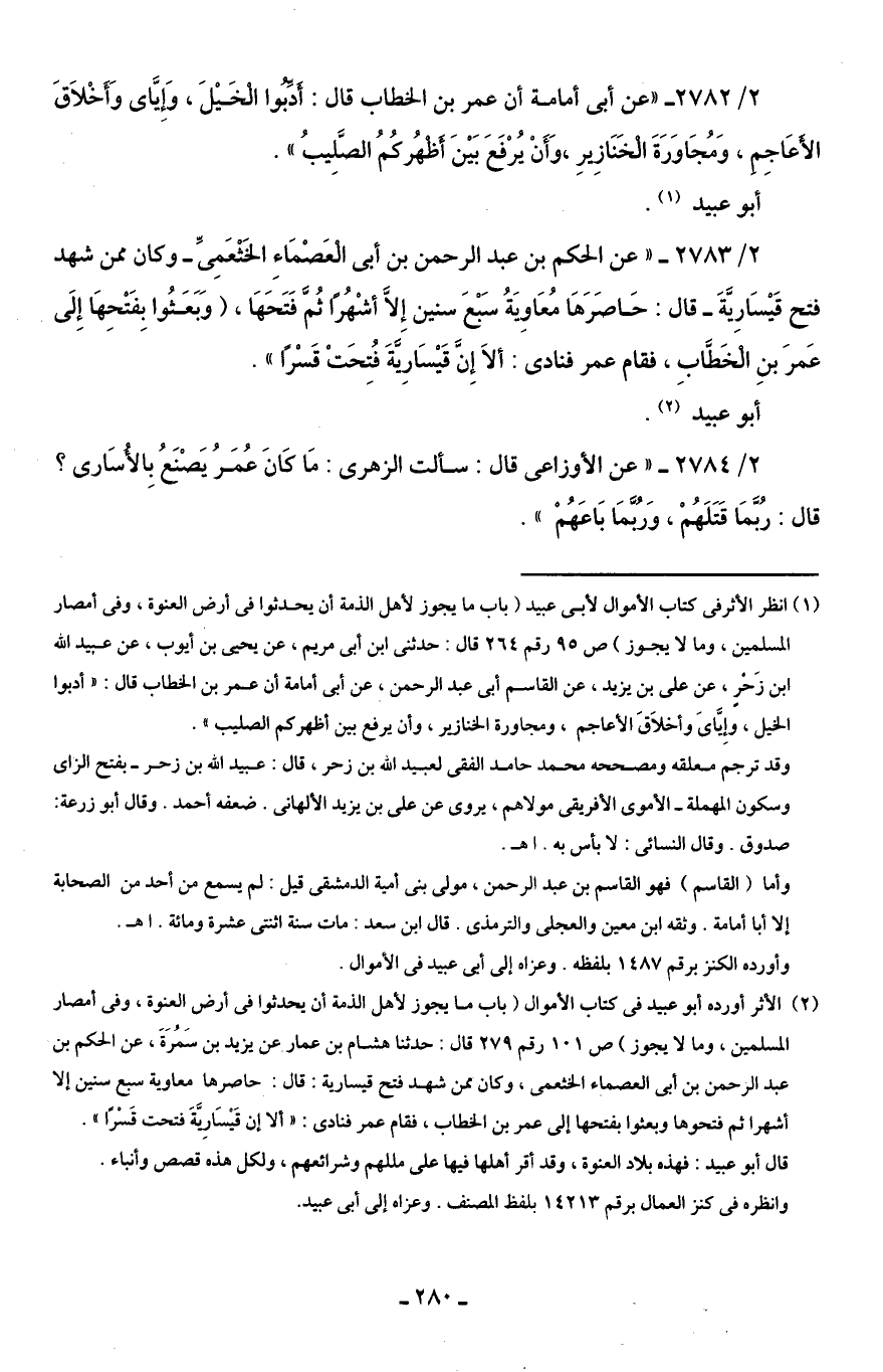 (¬1) انظر الأثر في كتاب الأموال لأبى عبيد (باب ما يجوز لأهل الذمة أن يحدثوا في أرض العنوة، وفى أمصار المسلمين، وما لا يجوز) ص 95 رقم 264 قال: حدثنى ابن أَبى مريم، عن يحيى بن أيوب، عن عبيد اللَّه ابن زَحْرٍ، عن على بن يزيد، عن القاسم أَبى عبد الرحمن، عن أَبى أُمامة أن عمر بن الخطاب قال: "أدبوا الخيل، وإِيَّاى وأخلَاقَ الأعاجم، ومجاورة الخنازير، وأن يرفع بين أظهركم الصليب".