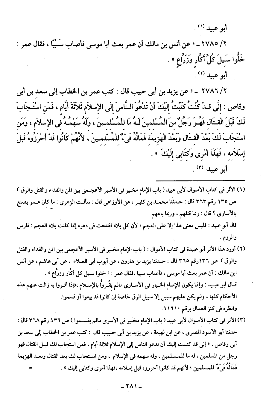 (¬2) أورد هذا الأثر أبو عبيدة في كتاب الأموال: (باب الأمام مخير في الأسير الأعجمى بين المن والفداء والقتل والرق) ص 136 رقم 365 قال: حدثنا يزيد بن هارون، عن أبوب أَبى العلاء، عن أَبى هاشم، عن أَنس ابن مالك: أن عمر بعث أبا موسى، فأصاب سبيا، فقال عمر: "خلوا سبيل كل أكَّار وزرَّاع".