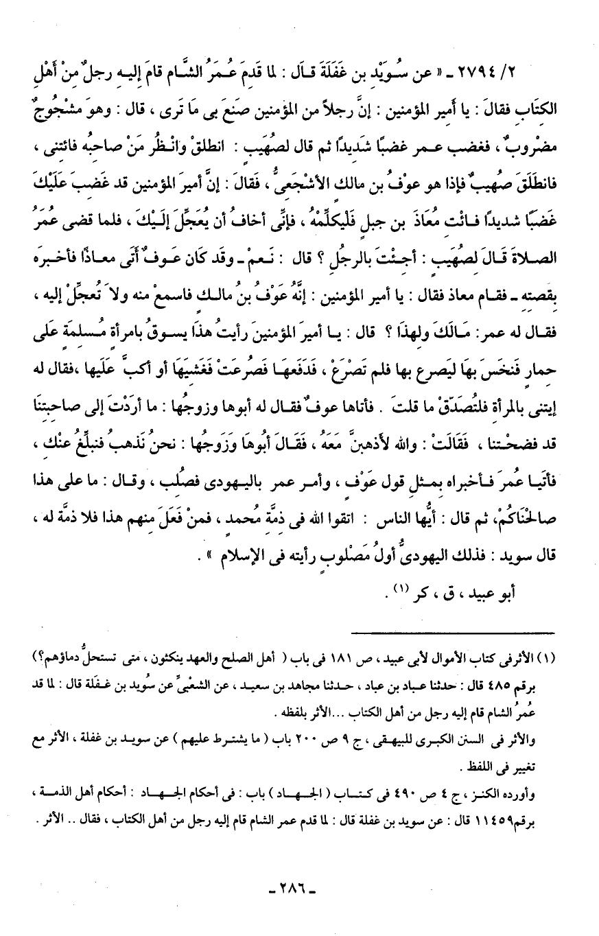(¬1) الأثر في كتاب الأموال لأبى عبيد، ص 181 في باب (أهل الصلح والعهد ينكثون، متى تستحلُّ دماؤهم؟ ) برقم 485 قال: حدثنا عباد بن عباد، حدثنا مجاهد بن سعيد، عن الشعْبىِّ عن سُويد بن غفَلة قال: لما قد عُمرُ الشام قام إليه رجل من أهل الكتاب. . . الأثر بلفظه.