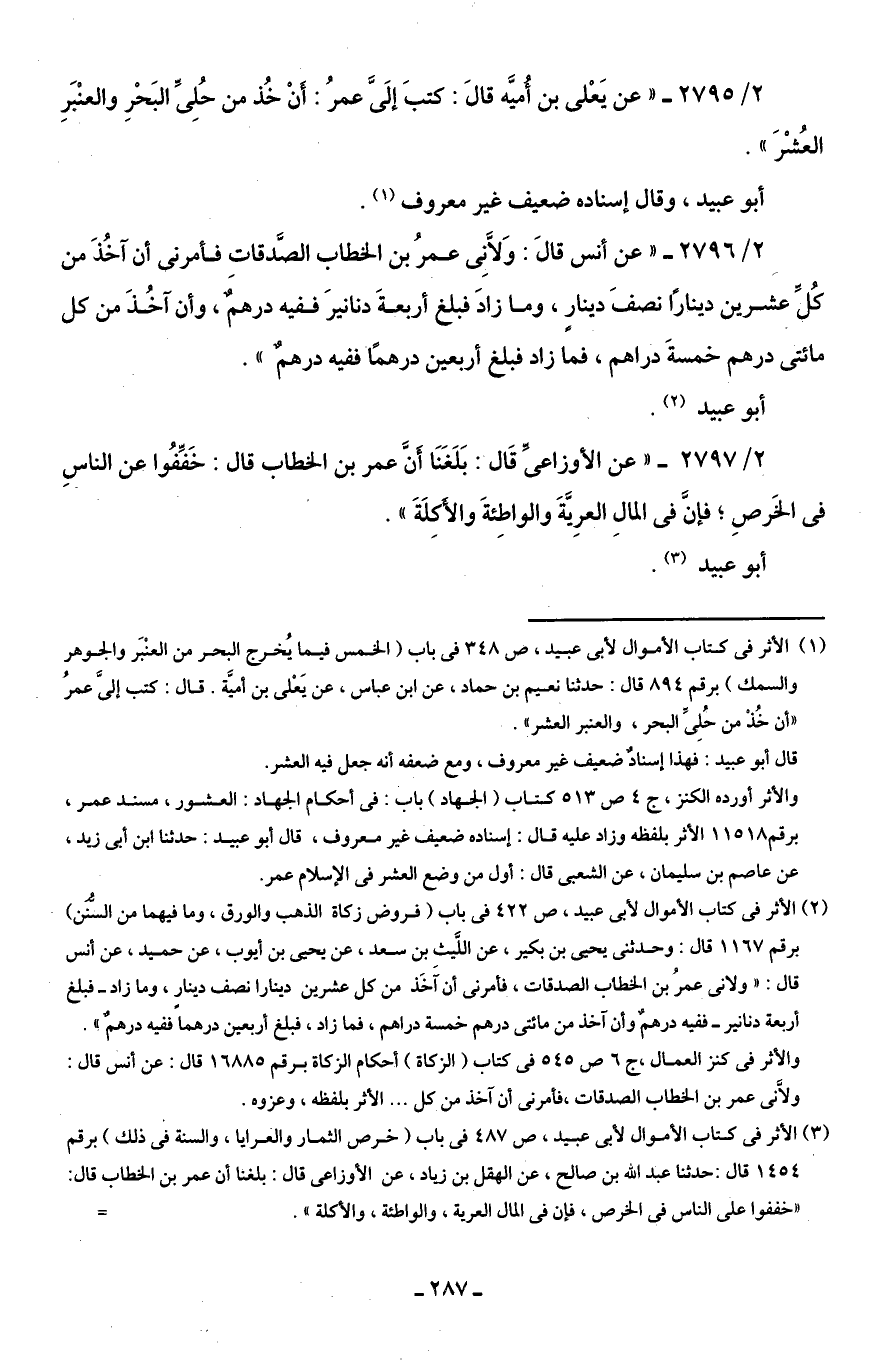 2/ 2795 - "عن يَعْلى بن أُميَّة قالَ: كتبَ إلَىَّ عمرُ: أَنْ خُذ من حُلِىِّ البَحْرِ والعنْبَرِ العُشْرَ".