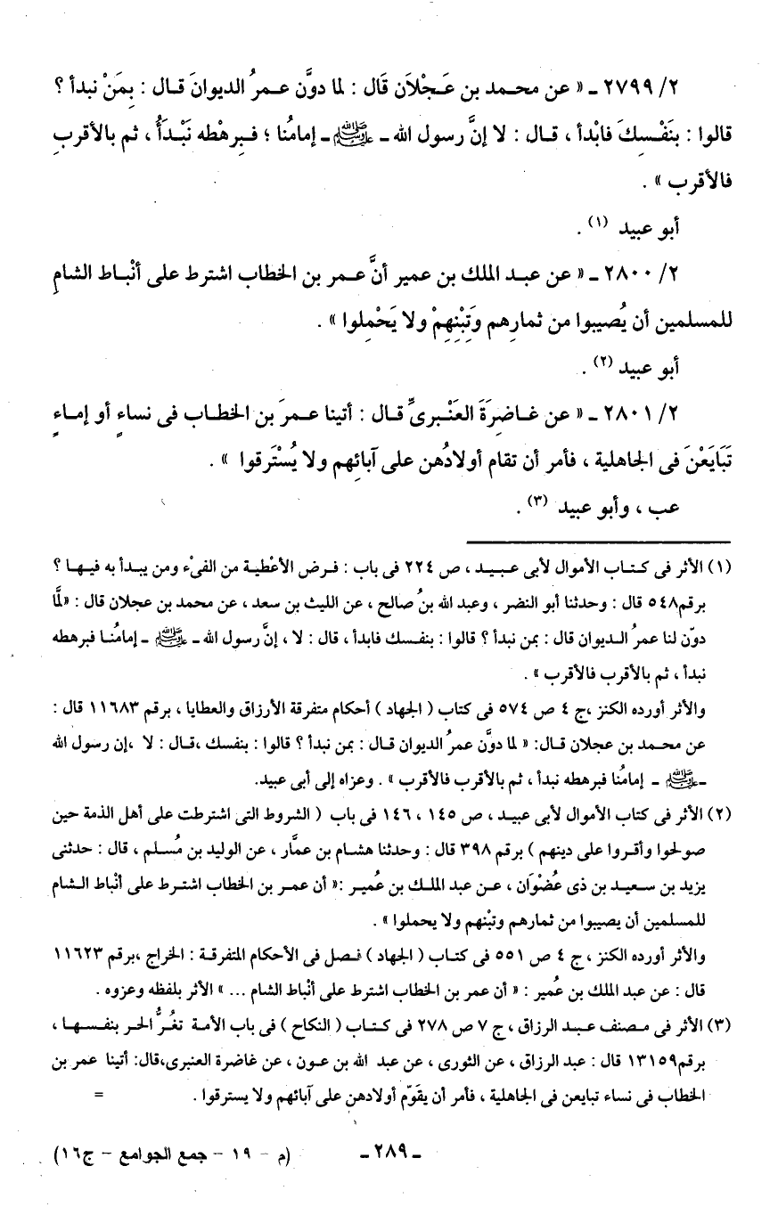 (¬1) الأثر في كتاب الأموال لأبى عبيد، ص 224 في باب: فرض الأعْطية من الفئ ومن يبدأ به فيها؟ برقم 548 قال: وحدثنا أبو النضر، وعبد اللَّه بنُ صالح، عن الليث بن سعد، عن محمد بن عجلان قال "لمَّا دوّن لنا عمر الديوان قال: بمن نبدأ؟ قالوا: بنفسك فابدأ، قال: لا، إِنَّ رسول اللَّه -صلى اللَّه عليه وسلم- إمامُنا فبرهطه نبدأ، ثم بالأقرب فالأقرب".