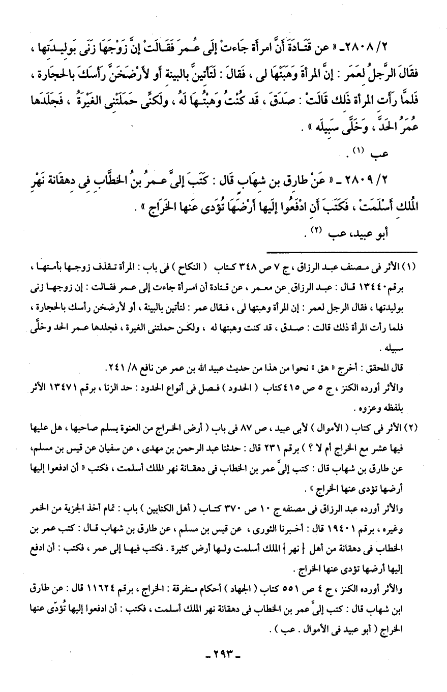 (¬2) الأثر في كتاب (الأموال) لأبى عبيد، ص 87 في باب (أرض الخراج من العنوة يسلم صاحبها، هل عليها فيها عشر مع الخراج أم لا؟ ) برقم 231 قال: حدثنا عبد الرحمن بن مهدى، عن سفيان عن قيس بن مسلم، عن طارق بن شهاب قال: كتب إلىَّ عمر بن الخطاب في دهقانة نهو الملك أسلمت، فكتب "أن ادفعوا إليها أرضها تؤدى عنها الخراج".