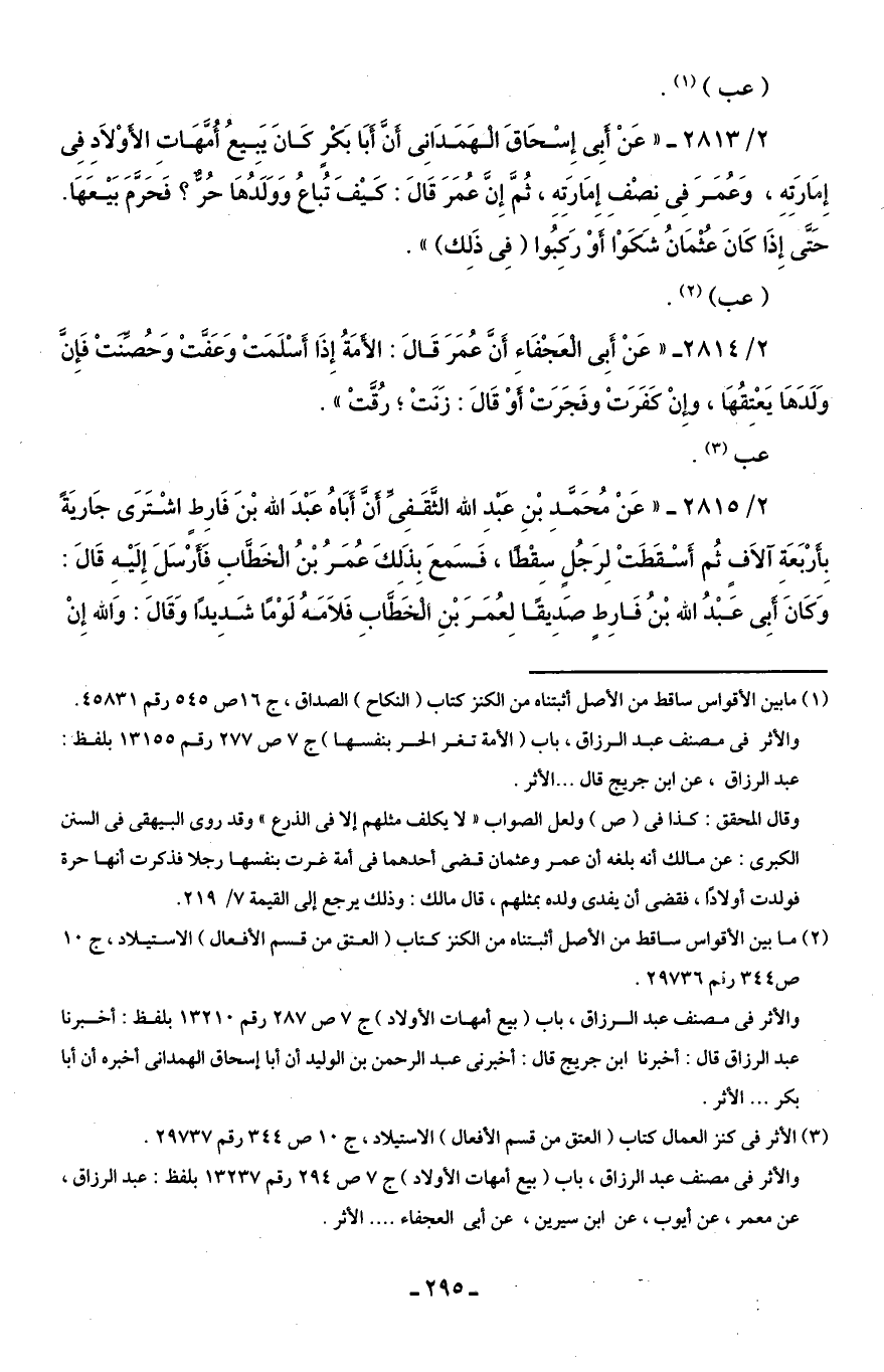 2/ 2813 - "عَنْ أَبِى إِسْحَاقَ الْهَمَدَانِى أَنَّ أَبَا بَكْرٍ كَانَ يَبِيعُ أُمَّهَاتِ الأَوْلَادِ فِى إِمَارَتِهِ، وَعُمَرَ فِى نِصْفِ إِمَارَتِهِ، ثُمَّ إِنَّ عُمَرَ قَالَ: كَيْفَ تُباعُ وَوَلَدُهَا حُرٌّ؟ فَحَرَّمَ بَيْعَهَا. حَتَّى إِذَا كَانَ عُثْمَانُ شَكَوْا أَوْ رَكِبُوا (فِى ذَلِك) ".