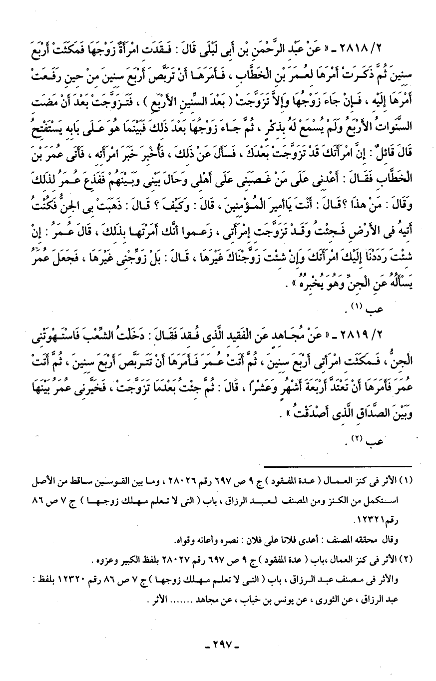 2/ 2818 - "عَنْ عَبْدِ الرَّحْمَنِ بْن أَبِى لَيْلَى قَالَ: فَقَدَت امْرَأَةٌ زَوْجَهَا فَمَكَثَتْ أَرْبَعَ سِنِينَ ثُمَّ ذَكَرَتْ أَمْرَهَا لِعُمَرَ بْنِ الْخَطَّابِ، فَأَمَرَهَا أَنْ تَرَبَّصَ أَرْبَعَ سِنِينَ مِنْ حِينِ رَفَعَتْ أَمْرَهَا إِلَيْهِ، فَإِنْ جَاءَ زَوْجُهَا وَإلَّا تَزَوَّجَتْ (بَعْدَ السِّنِينِ الأَرْبَعِ)، فَتَزَوَّجَتْ بَعْدَ أَنْ مَضَتِ السَّنَواتُ الأَرْبَعُ وَلَمْ يُسْمَعْ لَهُ بِذِكْرٍ، ثُمَّ جَاءَ زَوْجُهَا بَعْدَ ذَلِكَ فَبَيْنَمَا هُوَ عَلَى بَابِهِ يَسْتَفْتِحُ قَالَ قَائِلٌ: إِنَّ امْرَأَتَكَ قَدْ تَزَوَّجَتْ بَعْدَكَ، فَسَأَلَ عَنْ ذَلِكَ، فَأخْبِرَ خَبَرَ امْرَأتِهِ، فَأَتَى عُمَرَ بْنَ الْخَطَّابِ فَقَالَ: أَعْدِنِى عَلَى مَنْ غَصَبَنِى عَلَى أَهْلِى وَحَالَ بَيْنِى وَبَيْنَهُمْ فَفَذِع عُمَرُ لِذَلكَ وَقَالَ: مَنْ هَذَا؟ قَالَ: أَنْتَ يَا أَمِيرَ الْمُؤْمِنينَ، قَالَ: وَكَيْفَ؟ قَالَ: ذَهَبَتْ بِى الجِنُّ فَكُنْتُ أَتِيهُ في الأَرْضِ فَجِئْتُ وَقَدْ تَزَوَّجَتِ إِمْرَأتِى، زَعموا أَنَّك أَمَرْتَها بِذَلِكَ، قَالَ عُمَرُ: إِنْ شِئْتَ رَدَدْنَا إِلَيْكَ امْرَأَتَكَ وَإِنْ شِئْتَ زَوَّجْنَاكَ غَيْرَهَا، قَالَ: بَلْ زَوِّجْنِى غَيْرَهَا، فَجَعَلَ عُمَرُ يَسْأَلُهُ عَنِ الْجِنِّ وَهُوَ يُخْبِرُهُ".