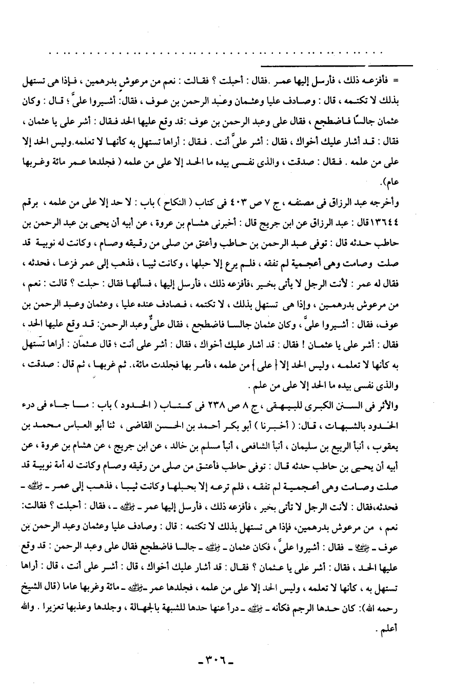 والأثر في السنن الكبرى للبيهقى، جـ 8 ص 238 في كتاب (الحدود) باب: ما جاء في درء الحدود بالشبهات، قال: (أخبرنا) أبو بكر أحمد بن الحسن القاضى، ثنا أبو العباس محمد بن يعقوب، أنبأ الربيع بن سليمان، أنبأ الشافعى، أنبأ مسلم بن خالد، عن ابن جريج، عن هشام بن عروة، عن أبيه أن يحيى بن حاطب حدثه قال: توفى حاطب فأعتق من صلى من رقيقه وصام وكانت له أمة نوبية قد صلت وصامت وهى أعجمية لم تفقه، فلم ترعه إلا بحبلها وكانت ثيبا، فذهب إلى عمر -رضي اللَّه عنه- فحدثه، فقال: لأنت الرجل لا تأتى بخير، فأفزعه ذلك، فأرسل إليها عمر -رضي اللَّه عنه-، فقال: أحبلت؟ فقالت: نعم، من مرعوش بدرهمين، فإذا هى تستهل بذلك لا تكتمه: قال: وصادف عليا وعثمان وعبد الرحمن بن عوف -رضي اللَّه عنهما- فقال: أشيروا علىَّ، فكان عثمان -رضي اللَّه عنه- جالسا فاضطجع فقال على وعبد الرحمن: قد وقع عليها الحد، فقال: أشر على يا عثمان؟ فقال: قد أشار عليك أخواك، قال: أشر على أنت، قال: أراها تستهل به، كأنها لا تعلمه، وليس الحد إلا على من علمه، فجلدها عمر -رضي اللَّه عنه- مائة وغربها عاما (قال الشيخ رحمه اللَّه): كان حدها الرجم فكأنه -رضي اللَّه عنه- درأ عنها حدها للشبهة بالجهالة، وجلدها وعذبها تعزيرا. واللَّه أعلم.