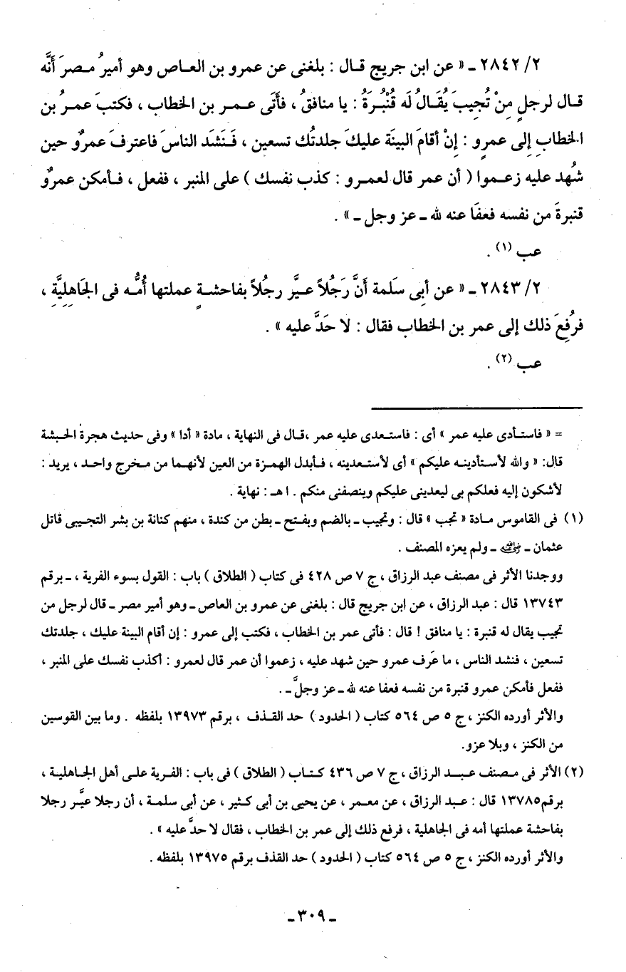 (¬2) الأثر في مصنف عبد الرزاق، جـ 7 ص 436 كتاب (الطلاق) في باب: الفرية على أهل الجاهلية، برقم 13785 قال: عبد الرزاق، عن معمر، عن يحيى بن أَبى كثير، عن أَبى سلمة، أن رجلا عيَّر رجلا بفاحشة عملتها أمه في الجاهلية، فرفع ذلك إلى عمر بن الخطاب، فقال لا حدَّ عليه".