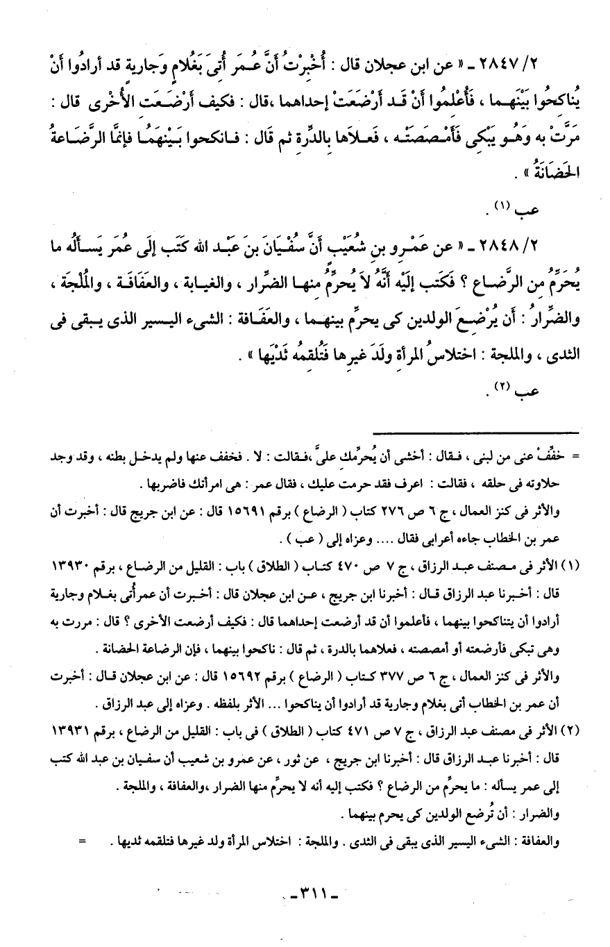 2/ 2847 - "عن ابن عجلان قال: أُخْبِرْتُ أَنَّ عُمَر أُتِى بَغُلامٍ وَجاريةٍ قد أرادُوا أَنْ يُناكِحُوا بَيْنَهما، فَأُعْلِمُوا أَنْ قَد أَرْضَعَتْ إحداهما، قال: فكيف أَرضَعَتِ الأُخْرى قال: مَرَّت به وَهُو تَبْكِى فَأَمْصَصَتْه، فَعلَاها بِالدِّرةِ ثم قَال: فانكحوا بَيْنهَمُا فإنَّما الرَّضَاعةُ الحَضَانَةُ".