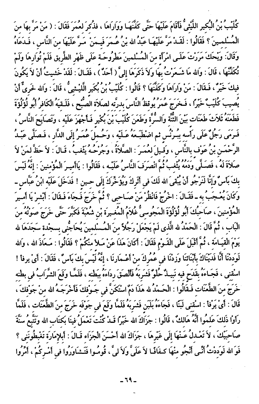 كُلَيْبُ بْنُ الْبُكِير اللَّيْثِىُّ فَأَقَامَ عَلَيْهَا حَتَّى كَفَّنَهَا وَوَارَاهَا، فذُكِرَ لِعُمَرَ فَقَالَ: (مَنْ مَرَّ بِهَا مِنَ الْمُسْلِمِينَ؟ فَقَالُوا: لَقَدْ مَرَّ عَلَيْهَا عَبْدُ اللَّه بْنُ عُمَرَ فَيِمَنْ مَرَّ عَلَيْهَا مِنَ النَّاسِ، فَدَعَاهُ وَقَالَ: وَيْحَكَ مَرَرْتَ عَلَى امْرَأَةٍ مِنَ الْمُسْلِمينَ مَطْرُوحَةٍ عَلَى ظَهْرِ الطَّرِيق فَلَمْ تُوَارِهَا وَلَمْ تُكَفِّنْهَا، قَالَ: وَاللَّه مَا شَعَرْتُ بِهَا وَلَا ذَكَرَهَا إِلىَّ (أحَدٌ)، فَقَالَ: لَقَدْ خَشِيتُ أَنْ لَا يَكُونَ فِيكَ خَيرٌ، فَقَالَ: مَنْ وَارَاهَا وَكَفَّنَهَا؟ قَالُوا: كُلَيْبُ بْنُ بُكَيرٍ الليْثِىُّ، قَالَ: وَاللَّه لحَرِىٌّ أَنْ يُصِيبَ كُلَيْبٌ خَيْرًا، فَخَرَجَ عُمَرُ يُوقِظُ النَّاسَ بِدِرَّتِهِ لِصَلَاةِ الصُّبْح، فَلَقِيَهُ الْكَافِرُ أَبُو لُؤْلُؤَةَ فَطَعَنَهُ ثَلَاثَ طَعَنَاتٍ بَيْنَ الثُّنَّةِ وَالسُّرَّةِ وَطَعَنَ كُلَيْبَ بْنَ بُكْيرٍ فَأَجْهَزَ عَلَيْهِ، وَتَصَايَحَ النَّاسُ، فَرَمَى رَجُلٌ عَلَى رَأَسِهِ بِبُرْنُسٍ ثم اضْطَبَعَهُ عَلَيْهِ، وَحُمِلَ عُمَرُ إِلَى الدَّارِ، فَصَلَّى عَبْدُ الرَّحْمَنِ بْنُ عَوْف بِالنَّاسِ، وَقِيلَ لِعُمَرَ: الصَّلَاةُ، وَجُرْحُهُ يَثْغبُ، قَالَ: لَا حَظَّ لمَنْ لَا صَلَاةَ لَهُ، فَصَلَّى وَدَمُهُ يُثْغِبُ ثُمَّ انْصَرَفَ النَّاسُ عَلَيْهِ، فَقَالُوا: يَا أَمِيرَ الْمُؤْمِنينَ: إِنَّهُ لَيْسَ بِكَ بَأسٌ وَإِنَّا لَنَرْجُو أَنْ يُبْقى اللَّه لَكَ فِى أَثَرِكَ وَيُؤَخِّرَكَ إِلَى حِينٍ! فَدَخَلَ عَلَيْه ابْنُ عَبَّاسٍ -وَكَانَ يُعْجَبُ بِه- فَقَالَ: اخْرُجْ فَانْظُرْ مَنْ صَاحِبِى؟ ثُمَّ خَرَجَ فَجَاءَ فَقَالَ: أَبْشِرْ يَا أَمِيرَ الْمُؤْمِنينَ، صَاحَبُكَ أَبُو لُؤْلُؤَةَ الْمَجُوسِىُّ غُلَامُ الْمُغِيرَة بْنِ شُعْبَةَ فَكَبَّرَ حَتَّى خَرَجَ صَوْتُهُ مِنَ الْبَاب، ثُمَّ قَالَ: الْحَمْدُ للَّه الَّذى لَمْ يَجْعَلْ رَجُلًا مِنَ الْمُسْلِمينَ يُحَاجُّنِى بِسجْدةٍ سَجَدَهَا للَّه يَوْمَ الْقِيَامَةِ، ثُمَّ أَقْبَلَ عَلَى الْقَوْمِ فَقَالَ: أَكَانَ هَذَا عَنْ مَلأٍ مَنكُمْ؟ فَقَالُوا: مَعَاذَ اللَّه، وَاللَّه لَوَدِدْنَا أَنَّا فَدَيْنَاكَ بِأَبْنَائِنَا وَزدْنَا فِي عُمُرِكَ مِنْ أَعْمَارنَا، إِنَّهُ لَيْسَ بِكَ بَأسٌ، فَقَالَ: أَىْ يرفأ! اسْقِنِى، فَجَاءَهُ بِقَدَحٍ فِيهِ نَبِيذٌ حُلْوٌ فَشَرِبَهُ فَأَلْصَقَ رِدَاءَهُ بِبَطْنِهِ، فَلَمَّا وَقَعَ الشَّرَابُ فِى بطْنِهِ خَرَجَ مِنَ الطَّعَنَاتِ فَقَالُوا: الْحَمْدُ للَّه هَذَا دَمٌ اسْتَكَنَّ فِي جَوْفِكَ فَأَخْرَجَهُ اللَّه مِنْ جَوْفِكَ، قَالَ: أَىْ يَرْفأ: اسْقِنِى لَبَنًا، فَجَاءَهُ بَلَبَنٍ فَشَرِبَهُ فَلَمَّا وَقَعَ فِى جَوْفَهِ خَرَجَ مِنَ الطَّعَنَات، فَلَمَّا رَأوْا ذَلِكَ عَلِمُوا أَنَّهُ هَالِكٌ، قَالُوا: جَزَاكَ اللَّه خَيْرًا قَدْ كُنْتَ تَعْمَلُ فِينَا بَكِتَابِ اللَّه وَتَتَّبِعُ سَنَّةَ صَاحِبَيْكَ، لَا تَعْدِلُ عَنْهَا إِلَى غَيْرِهَا، جَزَاكَ اللَّه أَحْسَنَ الْجَزَاءِ قَالَ: أَبِلإِمَارَةِ تَغْبِطُونَنِى؟ فَوَاللَّه لَوَدِدْتُ أَنِّى أَنْجُو مِنْهَا كفَافًا لَا عَلَىَّ وَلَا لىَّ، قُومُوا فَتَشَاوَرُوا فِى أَمْرِكُمْ، أَمِّرُوا