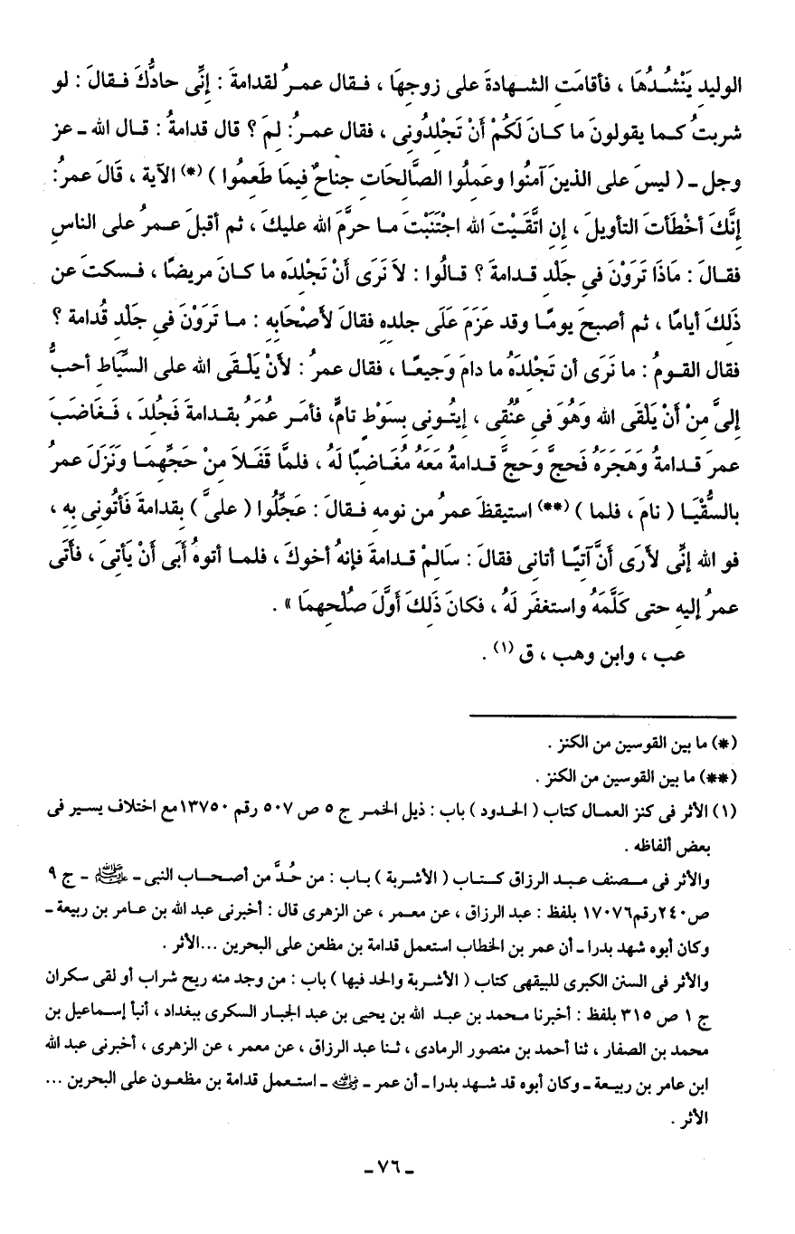 الوليدِ يَنْشُدُهَا، فأَقامَتِ الشهادةَ على زوجِهَا، فقال عمرُ لقدامةَ: إِنِّى حادُّكَ فقالَ: لو شربتُ كما يقولونَ ما كَانَ لَكُمْ أَنْ تَجْلِدُونِى، فقال عمرُ: لِمَ؟ قال قدامةُ: قال اللَّه -عز وجل- {لَيْسَ عَلَى الَّذِينَ آمَنُوا وَعَمِلُوا الصَّالِحَاتِ جُنَاحٌ فِيمَا طَعِمُوا} (*) الآية، قَالَ عمرُ: إِنَّكَ أخْطأتَ التأويلَ، إِنِ اتَقَيْتَ اللَّه اجْتَنَبْتَ ما حرَّمَ اللَّه عليكَ، ثم أقبلَ عمرُ على النَّاسِ فقالَ: مَاذَا تَرَوْنَ فِى جَلدِ قدامةَ؟ قالُوا: لَا نَرَى أَنْ تَجْلِدَه ما كَانَ مريضًا، فسكتَ عن ذَلِكَ أيامًا، ثم أصبحَ يومًا وقد عَزَمَ عَلَى جلدِهِ فقالَ لأَصْحَابهِ: ما تَرَوْنَ فِى جَلْدِ قُدامة؟ فقال القومُ: ما نَرَى أن تَجْلِدَه ما دامَ وَجيعًا، فقال عمرُ: لأَنْ يَلْقَى اللَّه على السِّيَاطِ أحبُّ إِلىَّ مِن أن يَلْقَى اللَّه وَهُوَ فِى عُنُقِى، إِيتونِى بِسَوْطٍ تامٍّ، فأمَر عُمَرُ بقدامةَ فَجُلِدَ، فَغَاضَبَ عمرَ قدامةُ وَهَجَرَهُ فَحجَّ وَحجَّ قدامةُ مَعَهُ مُغَاضبًا لَهُ، فلمَّا قَفَلَا مِنْ حَجِّهِمَا وَنَزَلَ عمرُ بالسُّقْيَا (نامَ، فلما) (* *) استيقظَ عمرُ من نومهِ فقالَ: عَجِّلُوا (على) بقدامةَ فَأتُونِى بهِ، فواللَّه إنِّى لأَرَى أَنَّ آتِيًا أَتانِى فقالَ: سَالِمْ قدامةَ فإنهُ أخوكَ، فلما أتوهُ أَبَى أَنْ يَأتِى، فَأَتَى عمرُ إليهِ حتى كَلَّمَهُ واستغفَر لَهُ، فكانَ ذَلِكَ أَوَّلَ صُلْحِهمَا".