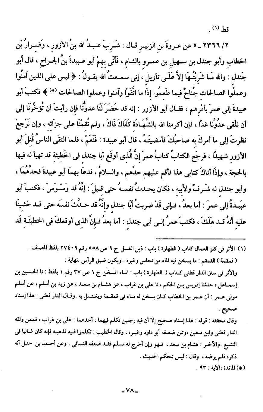 2/ 2366 - "عن عروةَ بنِ الزبيرِ قال: شَرِبَ عبدُ اللَّه بنُ الأزورِ، وَضِرارُ بْن الخطابِ وأَبو جندل بن سهيلِ بن عمرو بالشام، فَأَتَى بِهِمْ أبو عبيدةَ بنُ الجراح، قال أَبو جَندلٍ: واللَّه مَا شَرِبْتُهَا إلَّا عَلَى تأويل، إنى سمعتُ اللَّه يقولُ: {لَيْسَ عَلَى الَّذِينَ آمَنُوا وَعَمِلُوا الصَّالِحَاتِ جُنَاحٌ فِيمَا طَعِمُوا إِذَا مَا اتَّقَوْا وَآمَنُوا وَعَمِلُوا الصَّالِحَاتِ (*)} فكتبَ أبو عبيدةَ إلى عمرَ بأَمْرِهم، فقال أبو الأزور: إنه قد حَضَرَ لَنَا عدونا فإِن رأيتَ أن تُؤخِّرَنَا إلى أن نلْقى عدُوَّنا غدًا، فإن أكرمنا اللَّه بالشَّهَادَةِ كَفَاكَ ذَاكَ، ولم تُقِمْنَا على جزَائِهِ، وإن نَرْجعْ نظرتَ إلى ما أمركَ بِه صاحبُكَ فأمضيتَهُ، قال أبو عبيدة: فَنَعَمْ، فلما التقَى النَّاسُ قُتِلَ أبو الأزورِ شهيدًا، فرجَع الكتابُ كتابُ عمرَ إِنَّ الَّذِى أوقَع أبا جندلٍ في الخَطِيئةِ قد تهيأ له فيها بالحجة، وإِذَا أتاكَ كتابى هذا فأقم عليهم حدَّهم، والسلامُ، فدعَا بهمَا أبو عبيدةَ فحدَّهُمَا، وأَبو جندلِ له شَرفٌ ولأبِيهِ، فكان يحدثُ نفسهُ حتى قيلَ: إنَّهُ قد وَسْوَسَ، فكتبَ أبو عبَيدةُ إلى عمرَ: أما بعدُ، فإنى قَدْ ضربتُ أبَا جندلٍ وإِنَّهُ قد حدَّثَ نفسَه حتى قد خشِينَا عليهِ أنهُ قد هَلَكَ، فكتبَ عمرُ إلى أَبى جندلٍ: أما بعدُ فإِنَّ الذِى أوقعكَ في الخطيئَةِ قَد