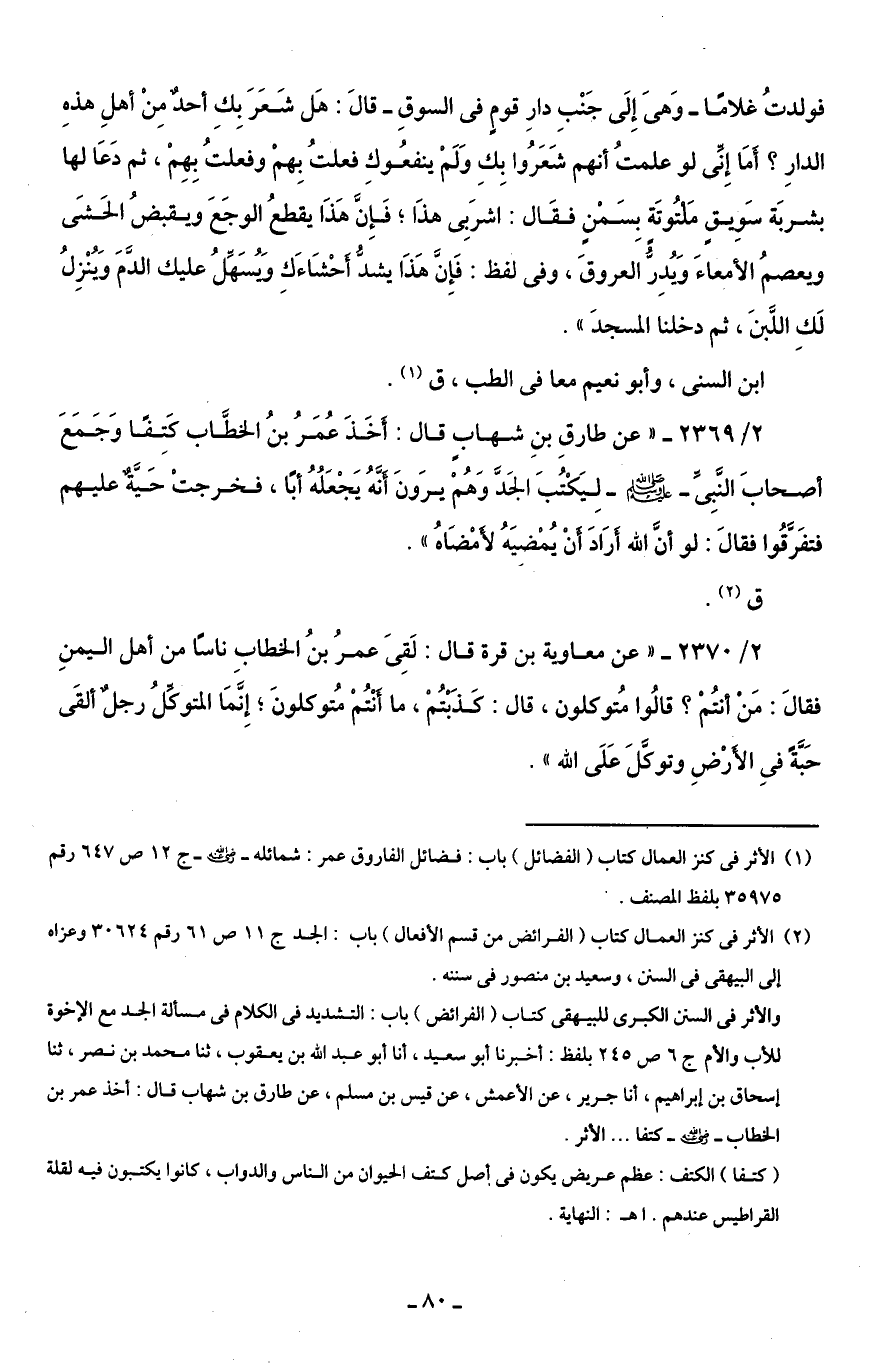 2/ 2369 - "عن طارقِ بنِ شهابٍ قال: أخَذَ عُمَرُ بنُ الخطَّاب كَتِفًا وَجَمَعَ أصحابَ النَّبِىِّ -صلى اللَّه عليه وسلم- لِيَكْتُبَ الجَدَّ وَهُمْ يرَونَ أَنَّهُ يَجْعَلُهُ أبًا، فخرجتْ حَيَّةٌ عليهم فتفَرَّقوا فقالَ: لو أَنَّ اللَّه أرَادَ أَنْ يُمْضِيَهُ لأمْضَاهُ".
