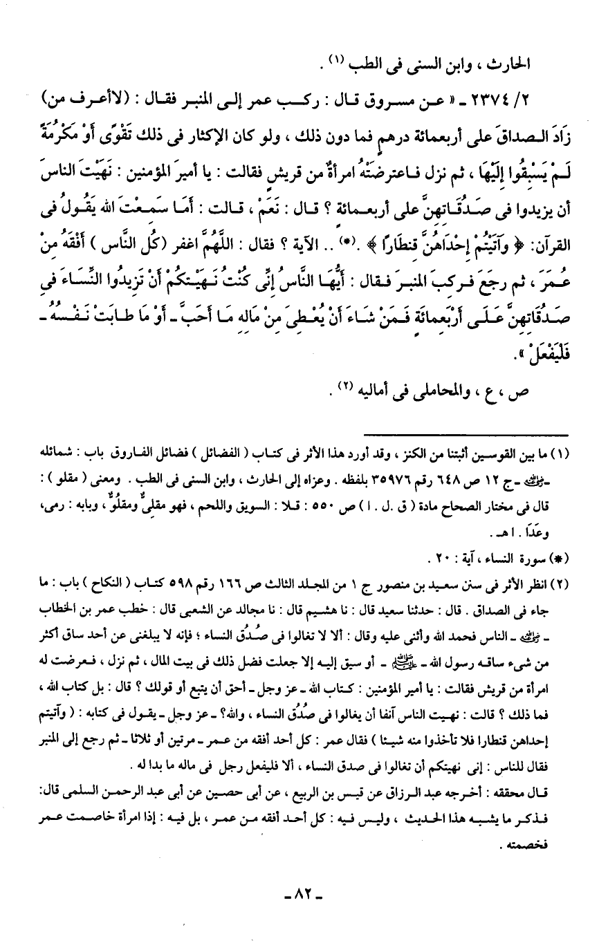 (¬2) انظر الأثر في سنن صعيد بن منصور جـ 1 من المجلد الثالث ص 166 رقم 598 كتاب (النكاح) باب: ما جاء في الصداق. قال: حدثنا سعيد قال: نا هشيم قال: نا مجالد عن الشعبى قال: خطب عمر بن الخطاب -صلى اللَّه عليه وسلم- الناس فحمد اللَّه وأثنى عليه وقال: ألا لا تغالوا في صُدُق النساء؛ فإنه لا يبلغنى عن أحد ساق أكثر من شئ ساقه رسول اللَّه -صلى اللَّه عليه وسلم- أو سيق إليه إلا جعلت فضل ذلك في بيت المال، ثم نزل، فعرضت له امرأة من قريش فقالت: يا أمير المؤمنين: كتاب اللَّه -عز وجل- أحق أن يتبع أو قولك؟ قال: بل كتاب اللَّه، فما ذلك؟ قالت: نهيت الناس آنفا أن يغالوا في صُدُق النساء، واللَّه؟ -عز وجل- يقول في كتابه: {وَآتَيْتُمْ إِحْدَاهُنَّ قِنْطَارًا فَلَا تَأْخُذُوا مِنْهُ شَيْئًا} فقال عمر: كل أحد أفقه من عمر -مرتين أو ثلاثا- ثم رجع إلى المنبر فقال للناس: إنى نهيتكم أن تغالوا في صدق النساء، ألا فليفعل رجل في ماله ما بدا له.