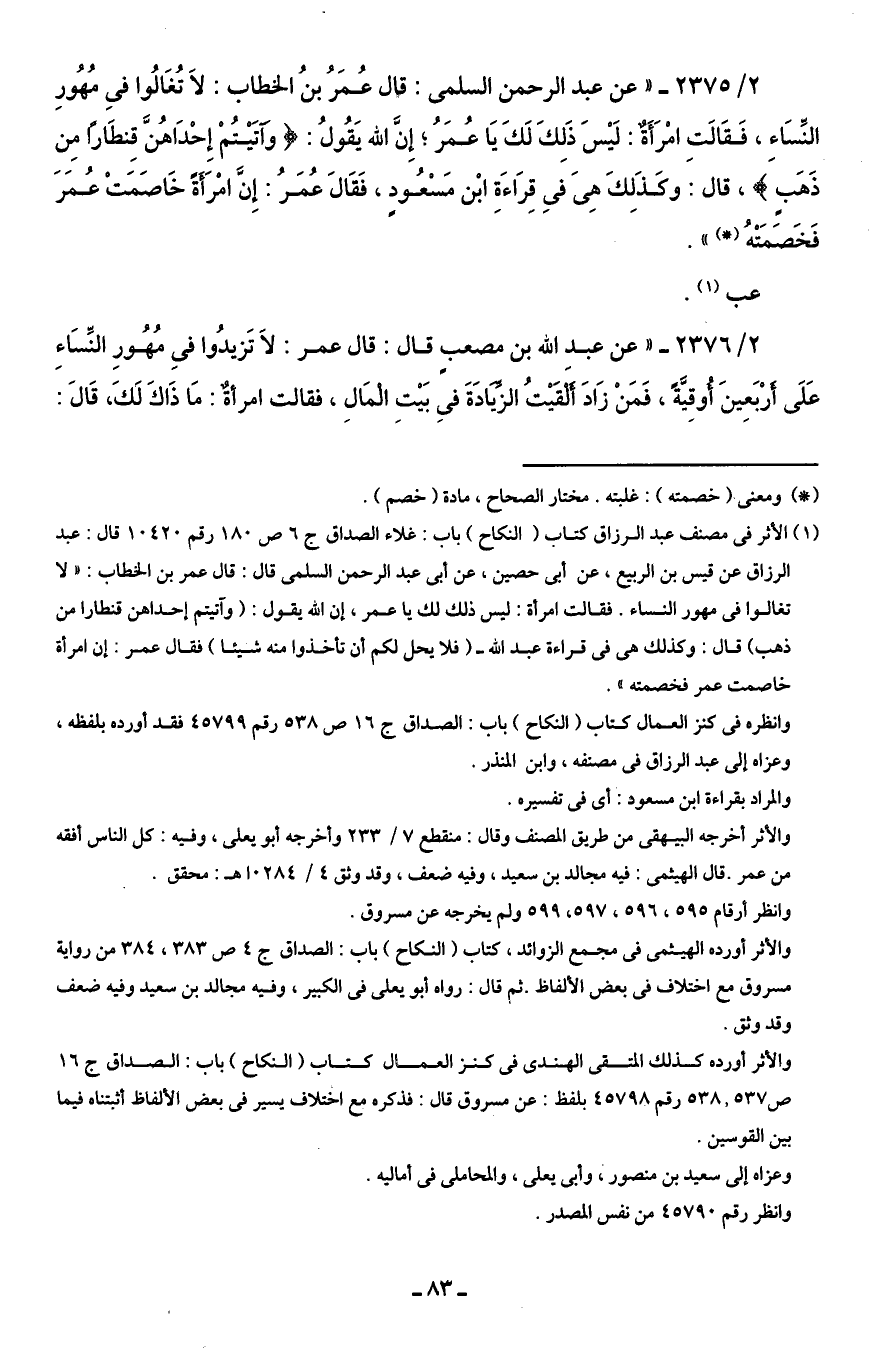2/ 2375 - "عن عبد الرحمن السلمى: قال عُمَرُ بنُ الخطاب: لَا تُغَالُوا فِى مُهُورِ النِّسَاء، فَقَالَتِ امْرَأَةٌ: لَيْسَ ذَلِكَ لَكَ يَا عُمَرُ؛ إِنَّ اللَّه يَقُولُ: {وَآتَيْتُمْ إِحْدَاهُنَّ قِنْطَارًا مِنْ ذَهَبٍ}، قال: وكذَلِكَ هِى فِى قِرَاءَةِ ابْن مَسعودٍ، فَقَالَ عُمَرُ: إِنَّ امْرَأةً خَاصَمَتْ عُمَرَ فَخَصَمَتْهُ (*) ".