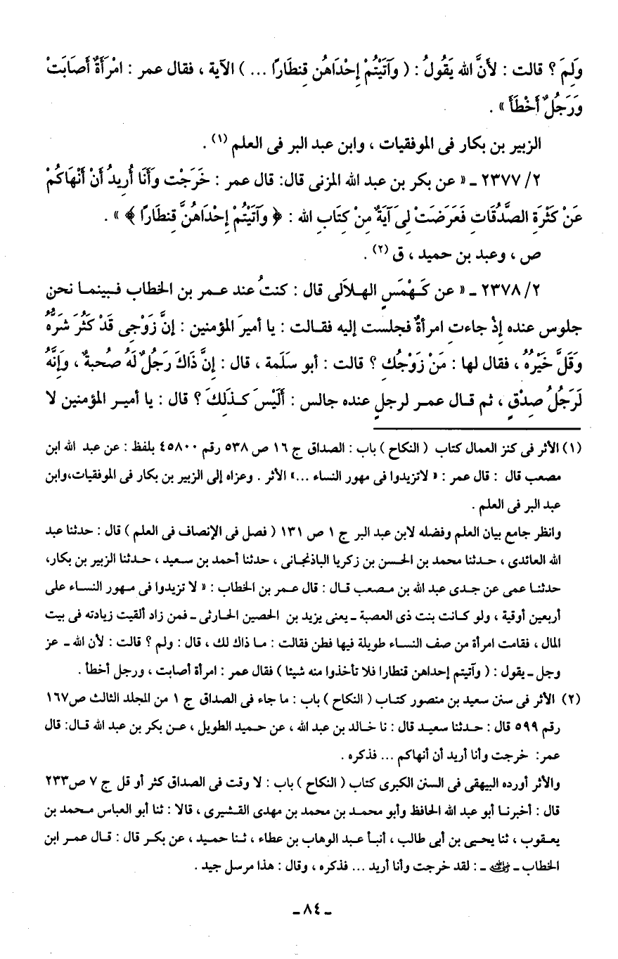 2/ 2377 - "عن بكر بن عبد اللَّه المزنى قال: قال عمر: خَرَجْت وَأَنَا أُرِيدُ أَنْ أَنْهَاكُمْ عَنْ كَثْرَةِ الصَّدُقَاتِ فَعَرَضَتْ لِى آيَةٌ مِنْ كِتَابِ اللَّه: {وَآتَيْتُمْ إِحْدَاهُنَّ قِنْطَارًا} ".