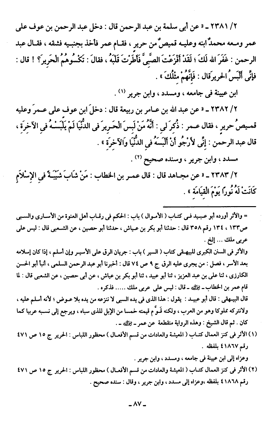 2/ 2382 - "عن عبد اللَّه بن عامر بن ربيعة قال: دخلَ ابن عوف على عمرَ وعليه قميصُ حريرٍ، فقال عمر: ذُكِرَ لِى: أنَّهُ مَنْ لَبِسَ الحَرِيرَ في الدُّنيَا لَمْ يَلبَسْهُ فِى الآخِرَةِ، قال عبد الرحمن: إِنِّى لأَرْجُو أَنْ أَلبَسَهُ فِى الدُّنيَا وَالآخِرَةِ".
