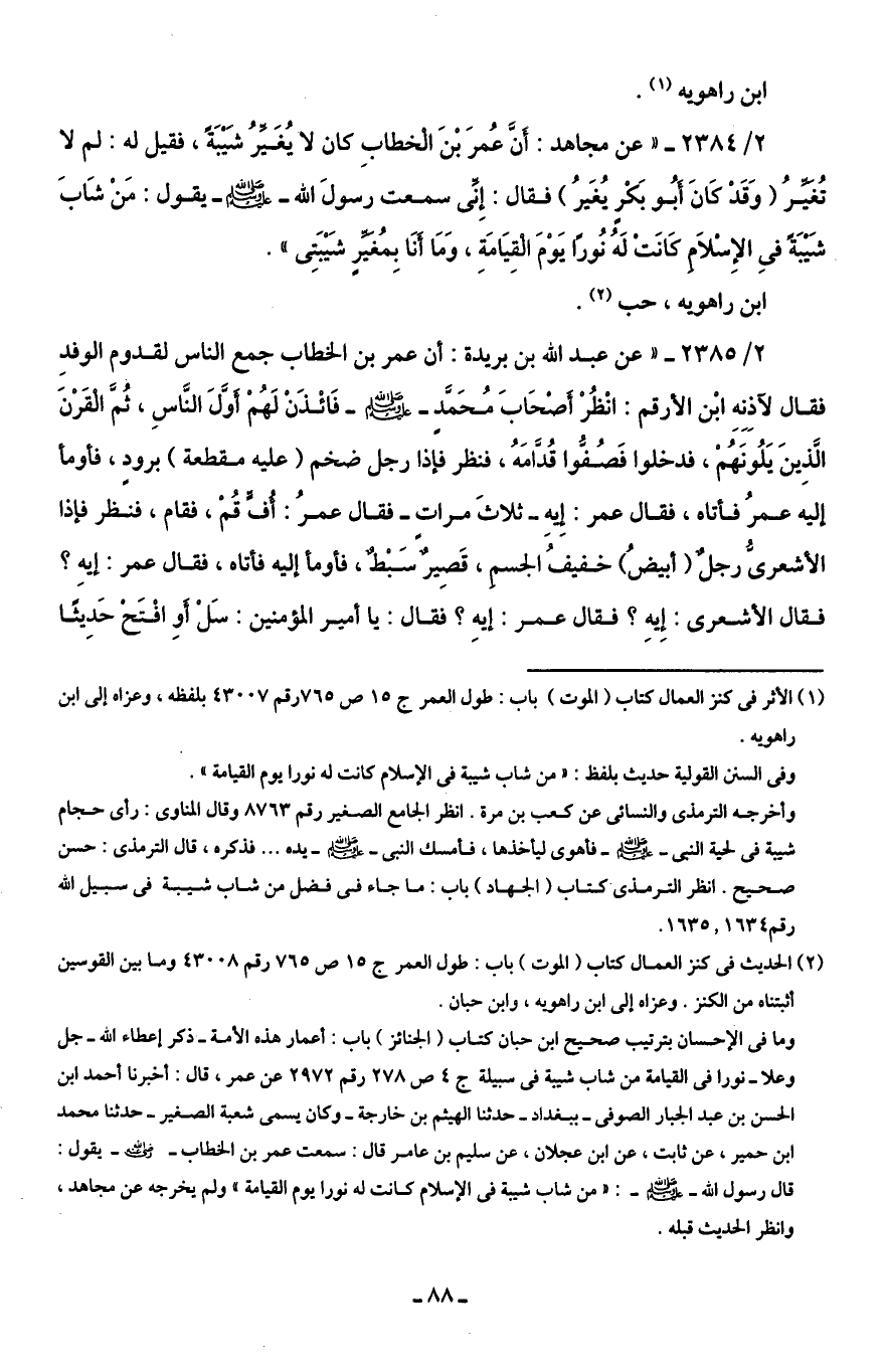 2/ 2384 - "عن مجاهد: أَنَّ عُمرَ بْنَ الْخطابِ كان لا يُغَيِّرُ شَيْبَةً، فقيل له: لم لا تُغَيِّرُ (وَقَدْ كَانَ أبُو بَكْرٍ يُغَيرُ) فقال: إِنِّى سمعت رسولَ اللَّه -صلى اللَّه عليه وسلم- يقول: مَنْ شَابَ شَيْبَةً فِى الإِسْلَامِ كَانَتْ لَهُ نُورًا يَوْمَ الْقِيَامَةِ، وَمَا أنَا بِمُغيِّرِ شَيْبَتِى".