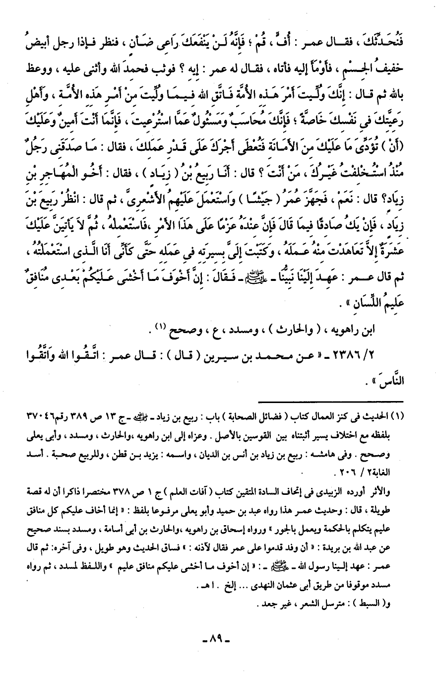 فَنُحَدِّثَكَ، فقال عمر: أُفٍّ، قُمْ؛ فَإِنَّهُ لَنْ يَنْفَعَكَ رَاعِى ضَأنٍ، فنظر فإذا رجل أبيضُ خفيفُ الجِسْمِ، فأَوْمَأَ إليه فأتاه، فقال له عمر: إِيهِ؟ فوثب فحمِدَ اللَّه وأثنى عليه، ووعظ باللَّه ثم قال: إِنَّكَ وُلِّيتَ أمْرَ هَذِهِ الأُمَّةِ فَاتَّقِ اللَّه فيمَا وُلِّيتَ مِنْ أَمْرِ هَذِهِ الأُمَّة، وَأَهْلِ رَعيَّتِكَ فِى نَفْسِكَ خَاصَّةً؛ فَإِنَّكَ مُحَاسَبٌ وَمَسْئُولٌ عَمَّا اسْتُرْعِيتَ، فَإِنَّمَا أَنْتَ أَمِينٌ وَعَلَيْكَ (أَنْ) تُؤَدِّى مَا عَلَيْكَ مِنَ الأَمَانَةِ فَتُعْطَى أَجْرَكَ عَلَى قَدْرِ عَمَلِكَ، فقال: مَا صَدَقَنِى رَجُلٌ مُنْذُ اسْتُخْلِفْتُ غَيْرُكَ، مَنْ أَنْتَ؟ قال: أَنَا رَبِيعُ بْنُ (زِيَادٍ)، فقال: أخُو الْمُهَاجِرِ بْنِ زِيَادٍ؟ قال: نَعَمْ، فَجَهَّزَ عُمَرُ (جَيْشًا) وَاسْتَعْمَلَ عَلَيْهِمُ الأَشْعِرِىَّ، ثم قال: انْظُرْ رَبِيعَ بْنَ زِيَادٍ، فَإِنْ يَكُ صَادِقًا فِيمَا قَالَ فَإِنَّ عِنْدَهُ عَزْمًا عَلَى هَذَا الأَمْرِ، فَاسْتَعْمِلهُ، ثُمَّ لَا يَأتيَنَّ عَلَيْكَ عَشَرَةٌ إِلَّا تَعَاهَدْتَ مِنْهُ عَمَلَهُ، وَكَتَبْتَ إِلَىَّ بِسِيرَتِهِ فِى عَمَلِهِ حَتَّى كَأَنِّى أَنَا الَّذِى اسْتَعْمَلتُهُ، ثم قال عمر: عَهِدَ إِلَيْنَا نَبِيُّنَا -صلى اللَّه عليه وسلم- فَقَالَ: إِنَّ أَخْوَفَ مَا أَخْشَى عَلَيْكُمْ بَعْدِى مُنَافِقٌ عَلِيمُ اللِّسَانِ".