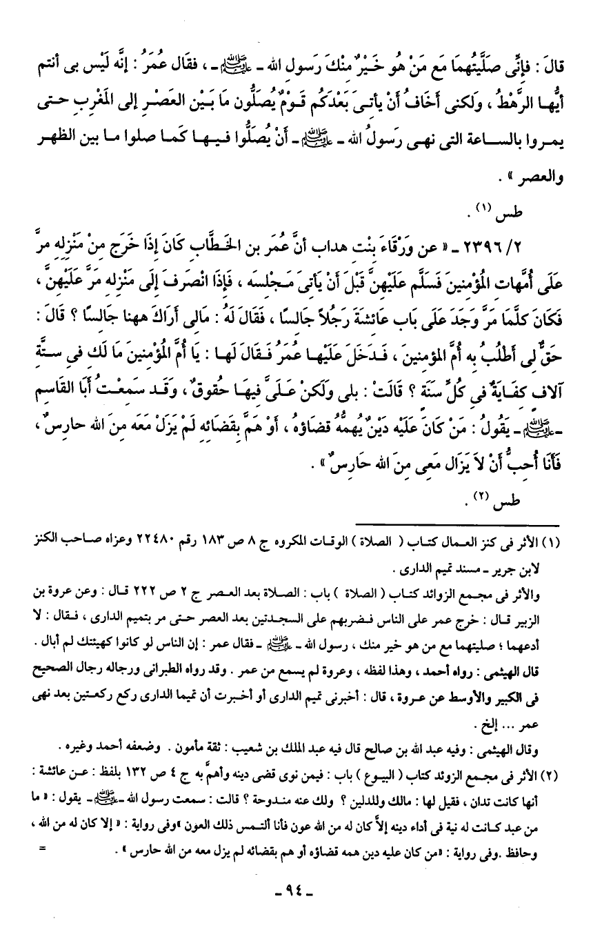 2/ 2396 - "عن وَرقَاءَ بِنْتِ هداب أَنَّ عُمَر بن الخَطَّابِ كَانَ إِذَا خَرَج مِنْ مَنْزِلِهِ مرَّ عَلَى أُمَّهاتِ المُؤْمِنينَ فَسَلَّم عَلَيْهِنَّ قَبْلَ أَنْ يَأتِى مَجْلِسَه، فَإِذَا انْصَرفَ إِلَى مَنْزِلهِ مَر عَلَيْهِنَّ، فَكَانَ كلَّمَا مَرَّ وَجَدَ عَلَى بَاب عَائِشَةَ رَجُلًا جَالِسًا، فَقَالَ لَهُ: مَالِى أَرَاكَ ههنا جَالِسًا؟ قَالَ: حَقٌّ أَطْلُبُ بِه أُمَّ المؤمِنينَ، فَدَخَلَ عَلَيْها عُمَرُ فَقَالَ لَها: يَا أُمَّ المُؤْمِنينَ مَا لَك فِى ستَّةِ آلافٍ كِفَايَةٌ فِى كُلِّ سَنَةٍ؟ قَالَتْ: بلى وَلَكنْ عَلَىَّ فِيهَا حُقوقٌ، وَقَد سَمِعْتُ أَبَا القَاسِم -صلى اللَّه عليه وسلم- يَقُولُ: مَنْ كَانَ عَلَيْه دَيْن يُهمُّهُ قضَاؤهُ، أَوْ هَمَّ بِقَضَائِهِ لَمْ يَزَلْ مَعَه مِنَ اللَّه حارِسٌ، فَأَنَا أحِبُّ أَنْ لَا يَزَال مَعِى مِنَ اللَّه حَارِسٌ".