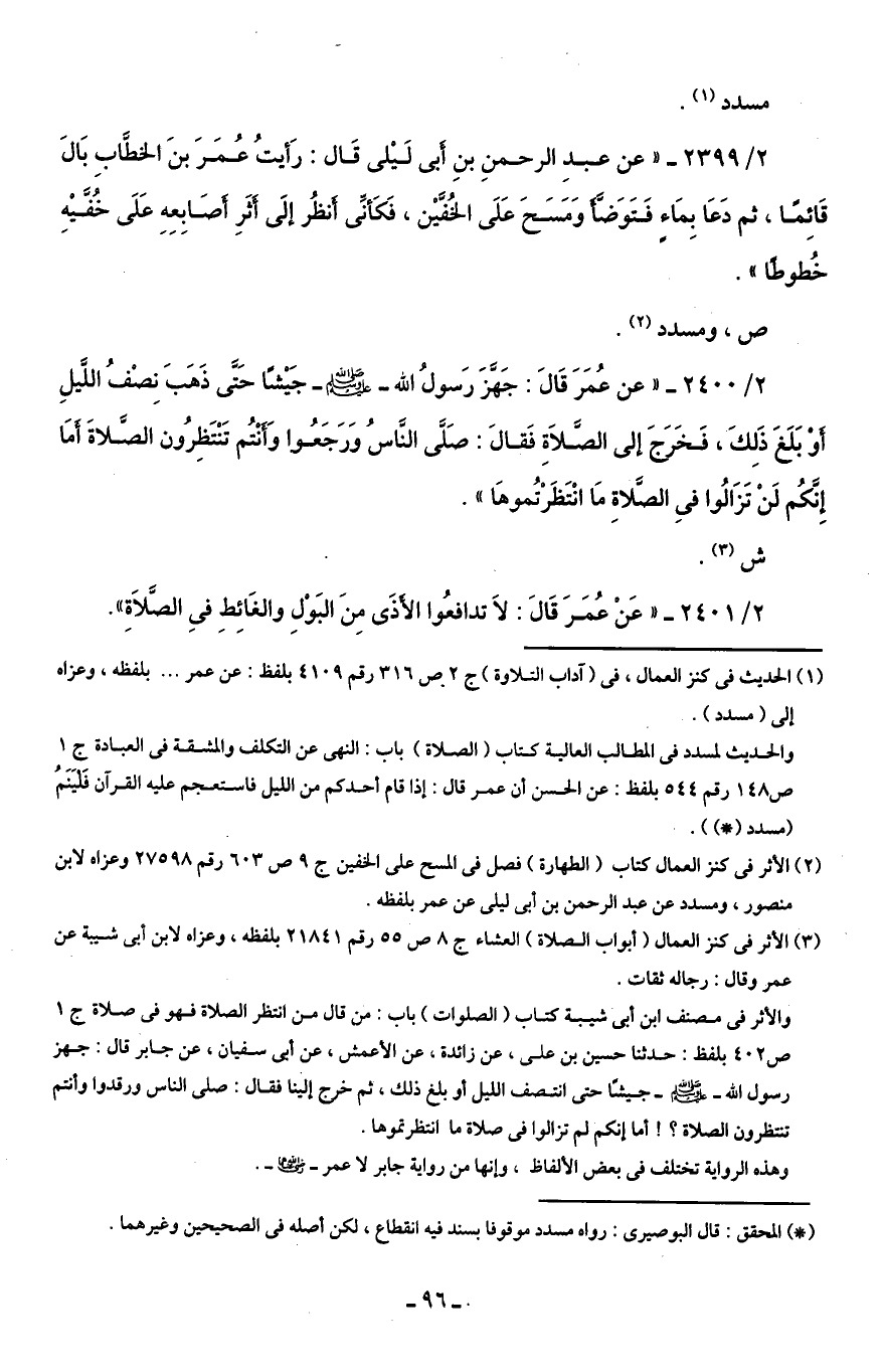 2/ 2401 - "عَنْ عُمَرَ قَالَ: لَا تدافعُوا الأَذَى مِنَ البَوْلِ والغائِطِ فِى الصَّلَاةِ".