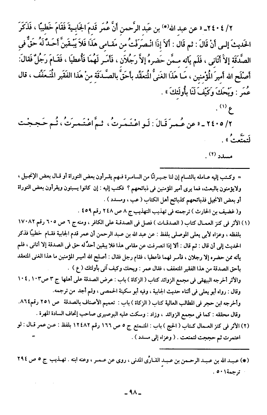 2/ 2404 - "عن عبدِ اللَّه (*) بن عَبدِ الرَّحمنِ أَنَّ عُمَر قَدِمَ الجَابِيةَ فَقَامَ خَطيبًا، فَذَكَرَ الحَديثَ إلى أَنْ قَالَ: ثم قَال: أَلَا إِذَا انْصَرَفْتُ مِن مَقامِى هَذَا فَلَا يَبْقَينَّ أَحَدٌ لَهُ حَقٌّ فِى الصَّدَقَةِ إلَّا أَتَانِى، فَلَم يَأْتِه مِمَّن حَضرهُ إلَّا رَجُلَانِ، فَأَمَر لَهُمَا فَأُعطيَا، فَقَامَ رَجُلٌ فَقالَ: أَصْلَح اللَّه أَمِيرَ المُؤْمِنيِن، مَا هَذَا الغَنىُّ المُتعَقِّد بأَحَقَّ بالصَّدَقَةِ مِنْ هَذَا الفَقَير المُتَعَفِّف، قال عُمَر: وَيْحَكَ وَكيْفَ لَنَا بأُولَئِكَ".
