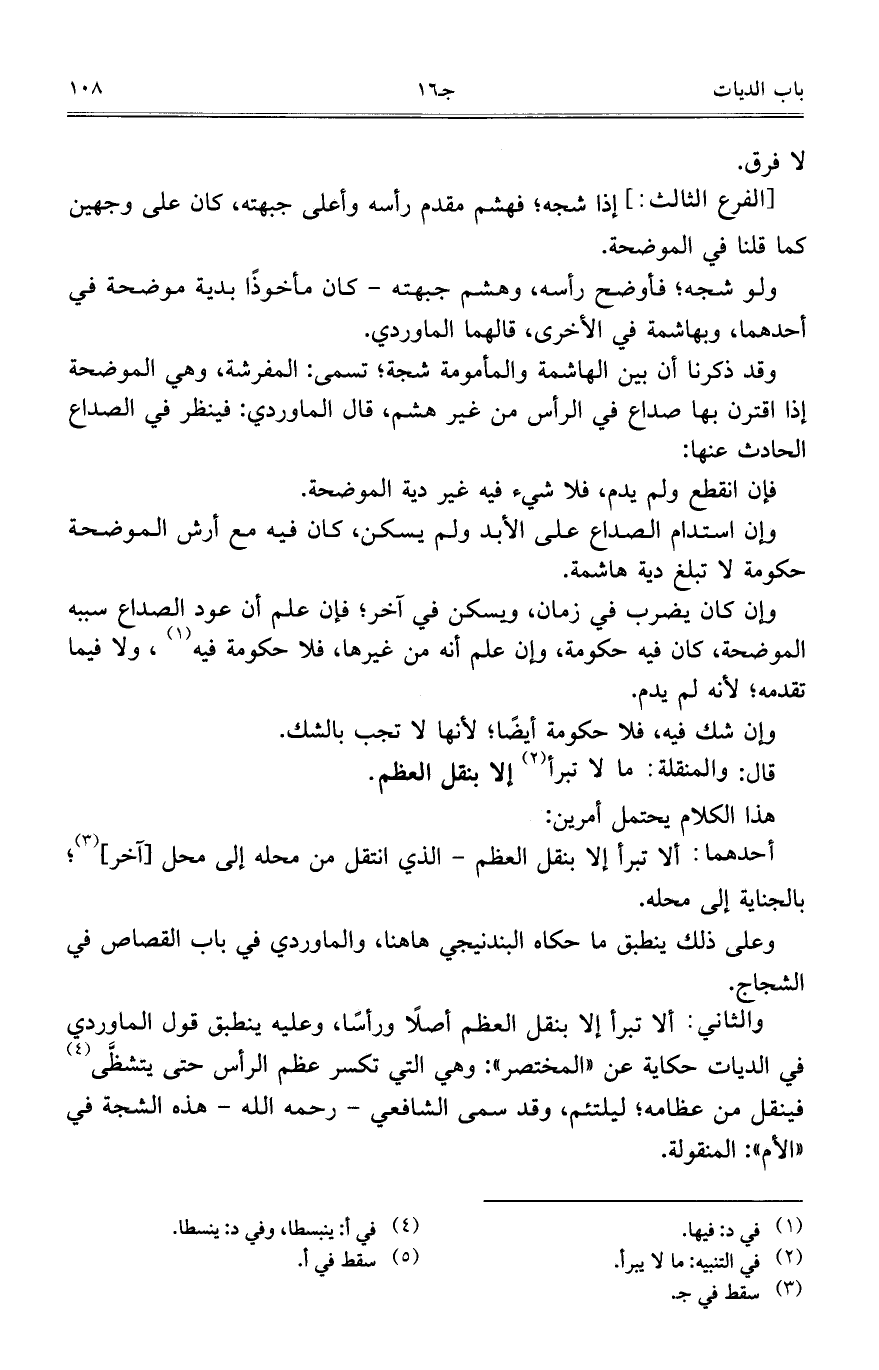 والثاني: ألا تبرأ إلا بنقل العظم أصلاً ورأساً، وعليه ينطبق قول الماوردي في الديات حكاية عن "المختصر": وهي التي تكسر عظم الرأس حتى يتشظَّى فينقل من عظامه؛ ليلتئم، وقد سمي الشافعي - رحمه الله - هذه الشجة في "الأم":المنقولة.