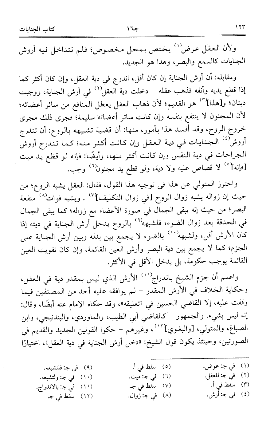 واحترز المتولي عن هذا في توجيه هذا القول، فقال: العقل يشبه الروح؛ من حيث إن زواله يشبه زوال الروح [في زوال التكليف]. ويشبه فوات منفعة البصر؛ من حيث إنه يبقى الجمال في صورة الأعضاء مع زواله؛ كما يبقى الجمال في الحدقة بعد زوال الضوء؛ فلشبهه بالروح يدخل أرش الجناية في ديته إذا كان الأرش أقل، ولشبهه بالضوء لا يجمع بين بدله وبين أرش الجناية على الجزم؛ كما لا يجمع بين دية البصر وأرش العين القائمة، وإن كان تفويت العين القائمة يوجب حكومة، بل يدخل الأقل في الأكثر.