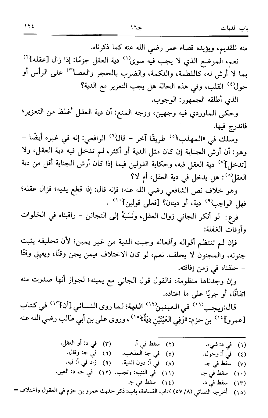 قال: ويجب في العينين الدية؛ لما روى النسائي [أن] في كتاب [عمرو] بن حزم: "وَفِي العَيْنَيْنِ دِيَةٌ"، وروى على بن أبي طالب رضي الله عنه