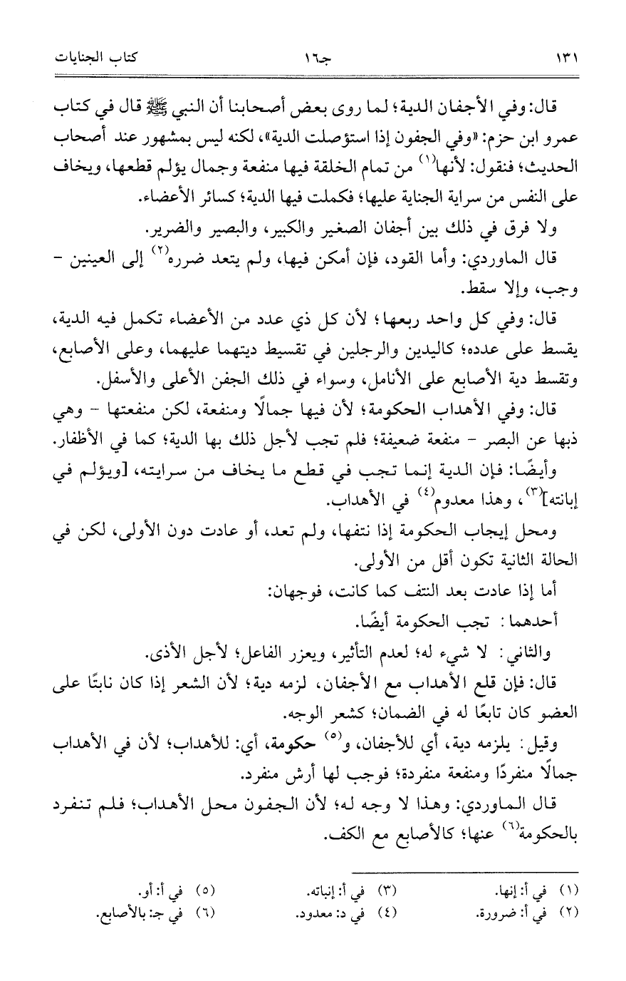 قال الماوردي: وهذا لا وجه له؛ لأن الجفون محل الأهداب؛ فلم تنفرد بالحكومة عنها؛ كالأصابع مع الكف.
