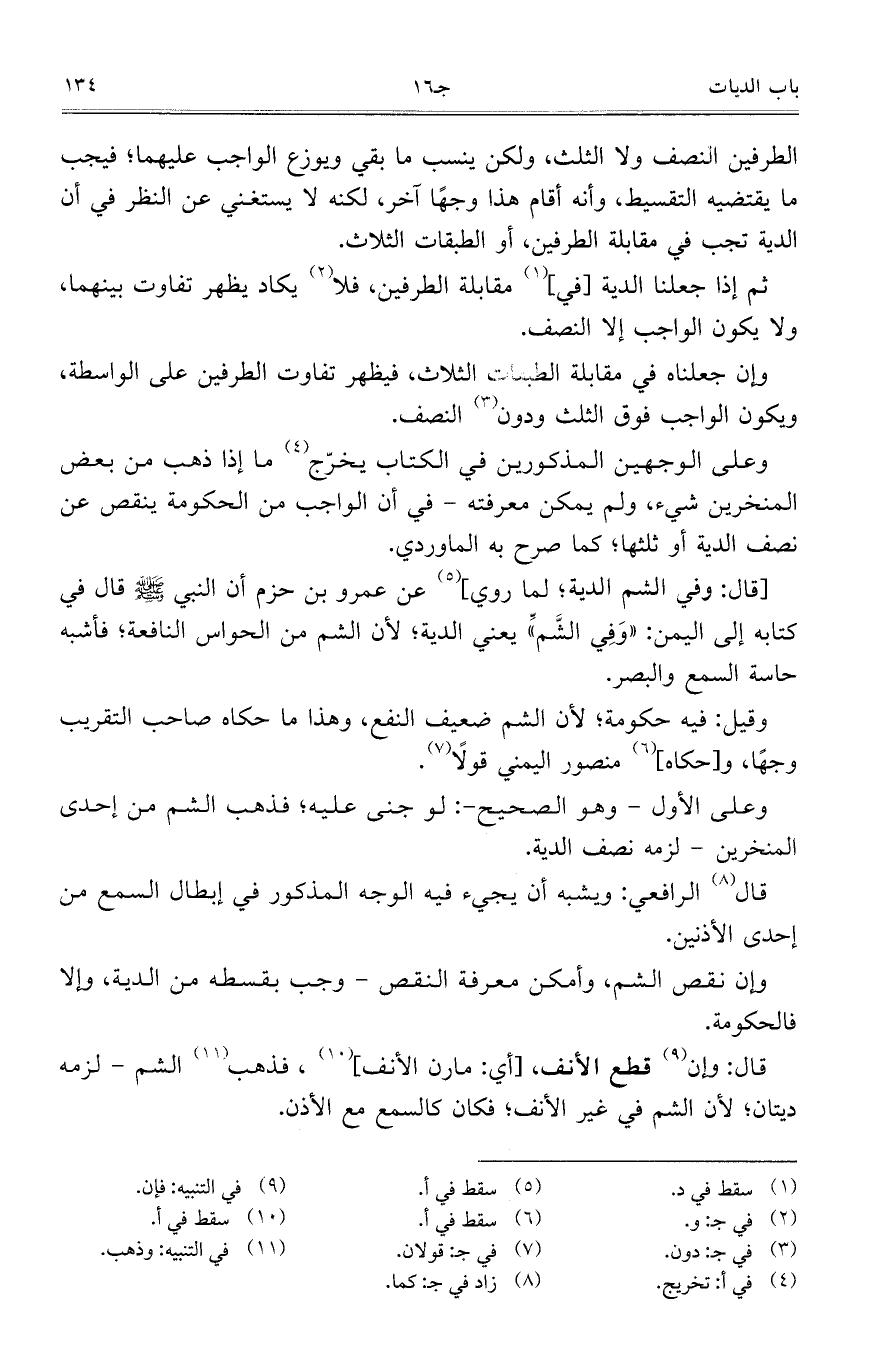 وعلى الوجهين المذكورين في الكتاب يخرّج ما إذا ذهب من بعض المنخرين شيء، ولم يمكن معرفته – في أن الواجب من الحكومة ينقص عن نصف الدية أو ثلثها؛ كما صرح به الماوردي.