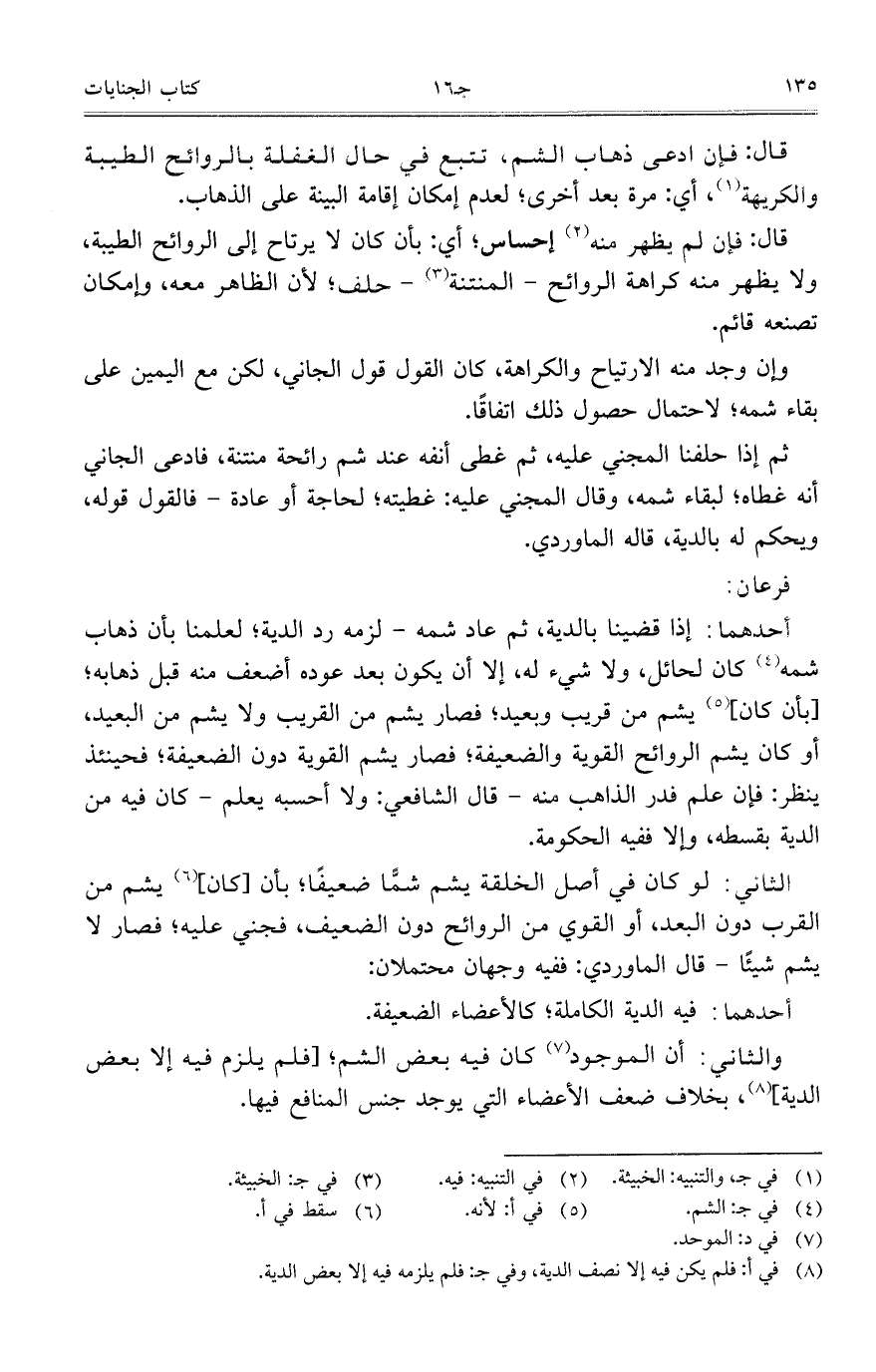 الثاني: لو كان في أصل الخلقة يشم شمًّا ضعيفاً؛ بأن [كان] يشم من القرب دون البعد، أو القوي من الروائح دون الضعيف، فجنى عليه؛ فصار لا يشم شيئاً – قال الماوردي: ففيه وجهان محتملان: