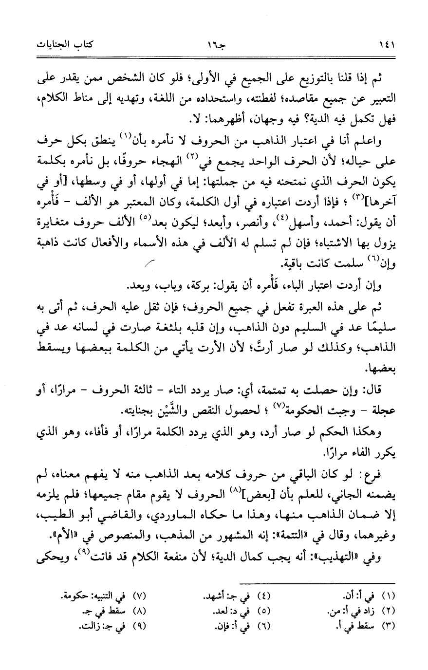 ثم على هذه العبرة تفعل في جميع الحروف؛ فإن ثقل عليه الحرف، ثم أتى به سليماً عد في السليم دون الذاهب، وإن قلبه بلثغة صارت في لسانه عد في الذاهب؛ وكذلك لو صار أرتَّ؛ لأن الأرت يأتي من الكلمة ببعضها ويسقط بعضها.