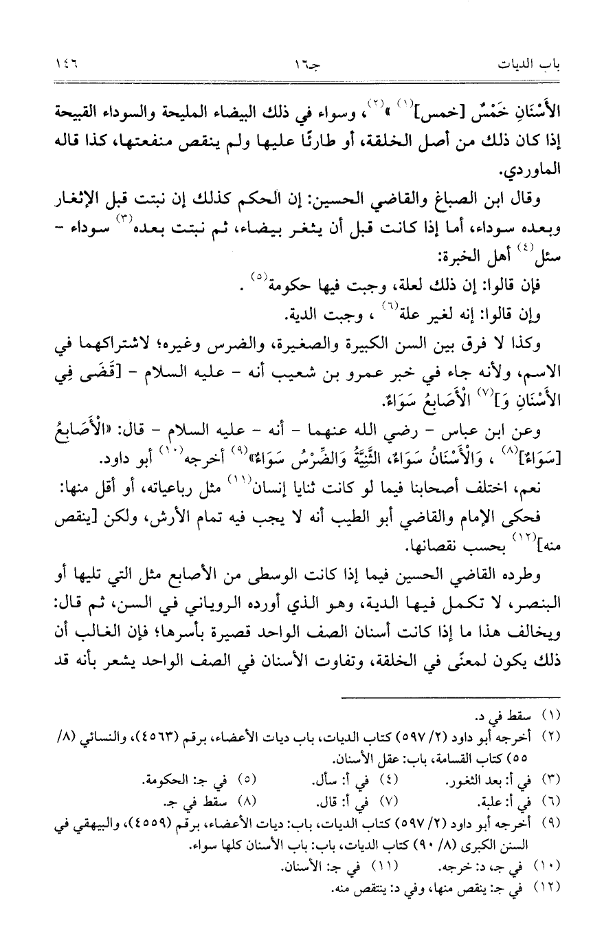 وعن ابن عباس - رضي الله عنهما - أنه - عليه السلام - قال: "الأَصَابعُ [سَوَاءٌ]، وَالأَسْنَانُ سَوَاءٌ، الثَّنِيَّةُ وَالضِّرْسُ سَوَاءٌ" أخرجه أبو داود.