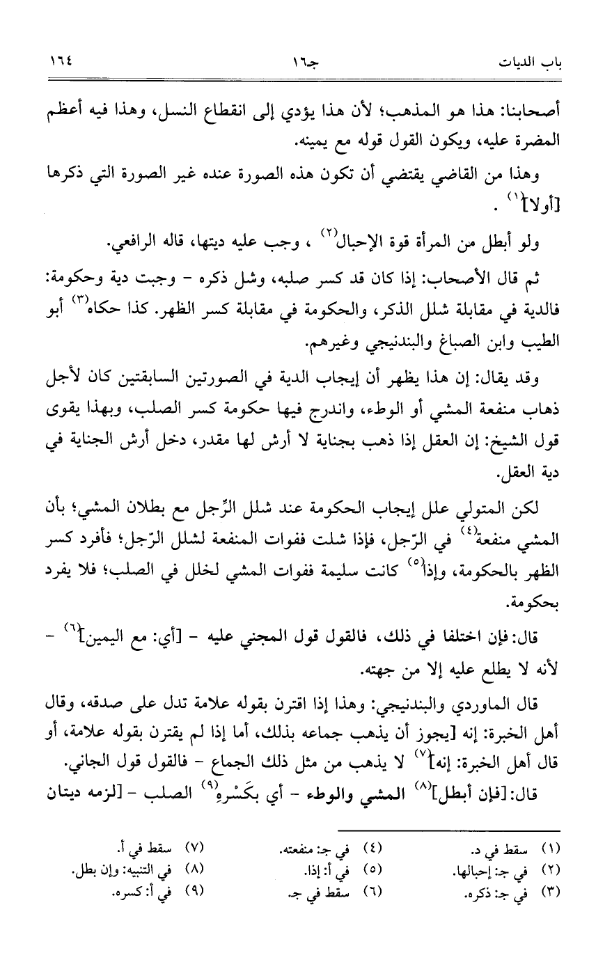 لكن المتولي علل إيجاب الحكومة عند شلل الرِّجل مع بطلان المشي؛ بأن المشي منفعة في الرّجل، فإذا شلت ففوات المنفعة لشلل الرّجل؛ فافرد كسر الظهر بالحكومة، وإذا كانت سليمة ففوات المشي لخلل في الصلب؛ فلا يفرد بحكومة.