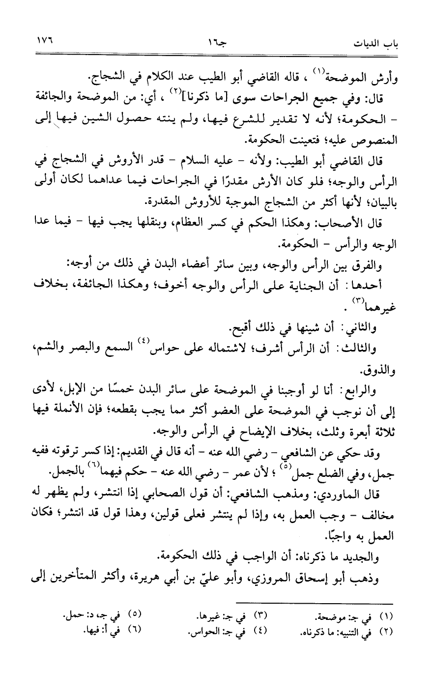 قال القاضي أبو الطيب: ولأنه – عليه السلام – قدر الأروش في الشجاج في الرأس والوجه؛ فلو كان الأرش مقدراً في الجراحات فيما عداهما لكان أولى بالبيان؛ لأنها أكثر من الشجاج الموجبة للأروش المقدرة.