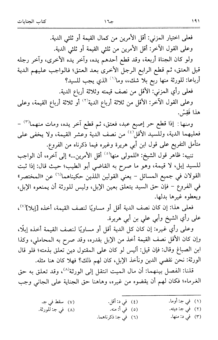 وعلى القول الآخر: الأقل من ثلاثة أرباع الدية أو ثلاثة أرباع القيمة، وعلى هذا فَقِسْ.