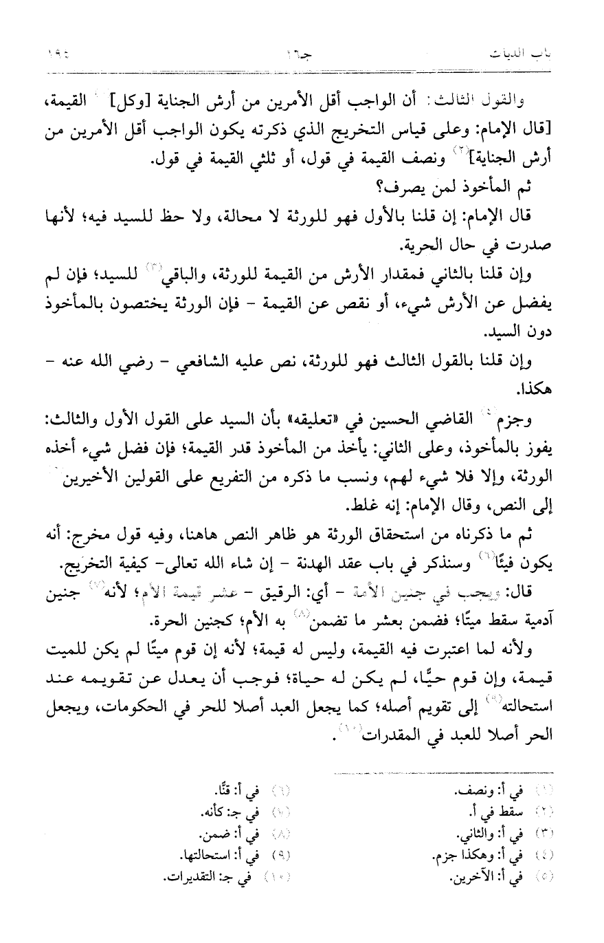 قال: ويجب في جنين الأمة –أي: الرقيق – عشر قيمة الأم؛ لأنه جنين آدمية سقط ميتاً؛ فضمن بعشر ما تضمن به الأم؛ كجنين الحرة.