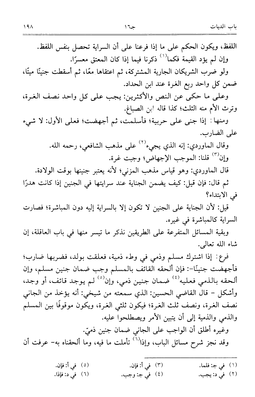 فرع: إذا اشترك مسلم وذمي في وطء ذمية، فعلقت بولد، فضربها ضارب؛ فأجهضت جنيناً -: فإن ألحقه القائف بالمسلم وجب ضمان جنين مسلم، وإن ألحقه بالذمي فعليه ضمان جنين ذمي، وإن لم يوجد قائف، أو وجد، وأشكل – قال القاضي الحسين: الذي سمعته من شيخي: أنه يؤخذ من الجاني نصف الغرة، ونصف ثلث الغرة؛ فيكون ثلثي الغرة، ويكون موقوفاً بين المسلم والذمي والذمية إلى أن يتبين الأمر ويصطلحوا عليه.