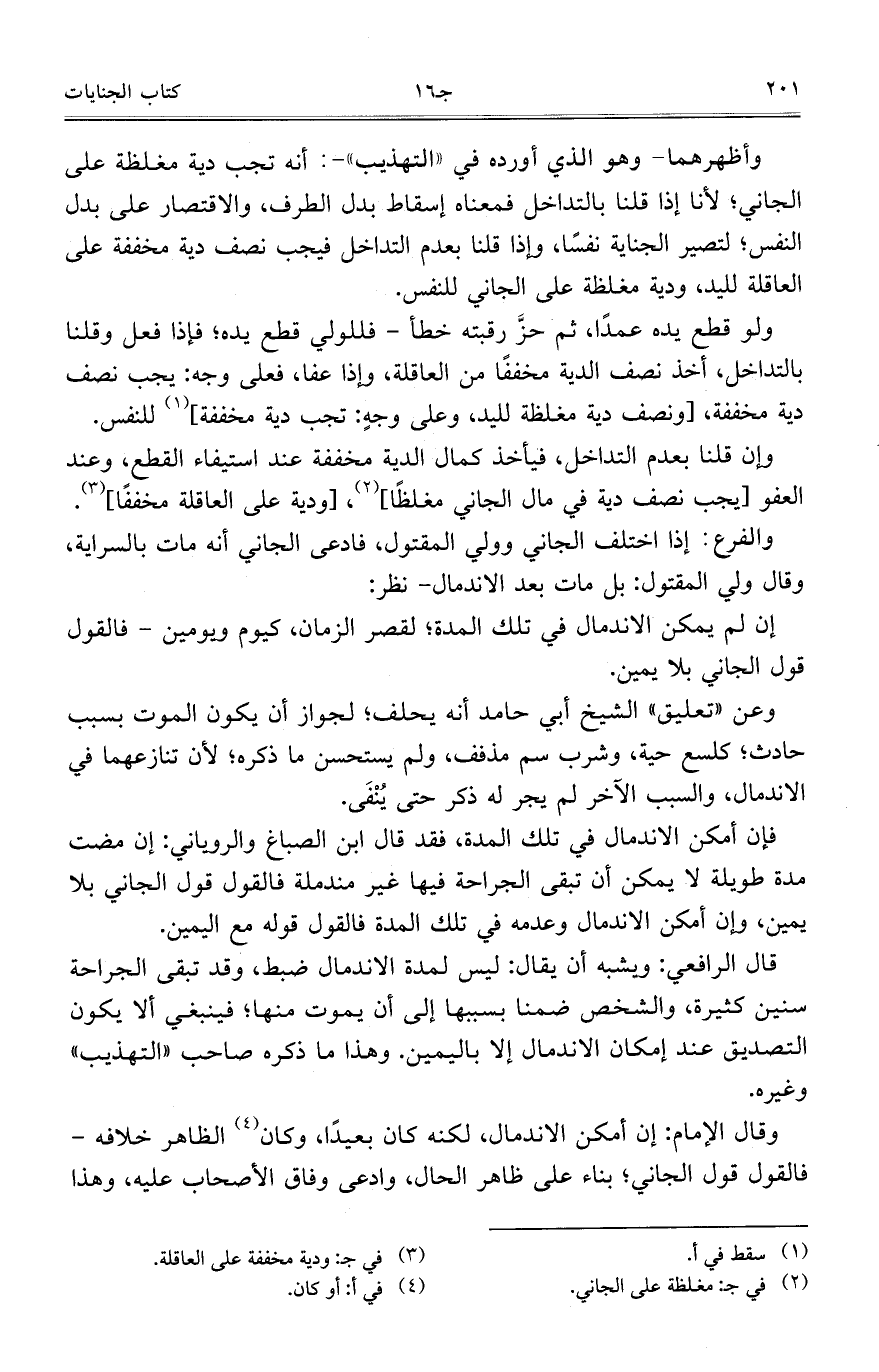 وأظهرهما – وهو الذي أورده في "التهذيب"-: أنه تجب دية مغلظة على الجاني؛ لأنا إذا قلنا بالتداخل فمعناه إسقاط بدل الطرف، والاقتصار على بدل النفس؛ لتصير الجناية نفساً، وإذا قلنا بعدم التداخل فيجب نصف دية مخففة على العاقلة لليد، ودية مغلظة على الجاني للنفس.