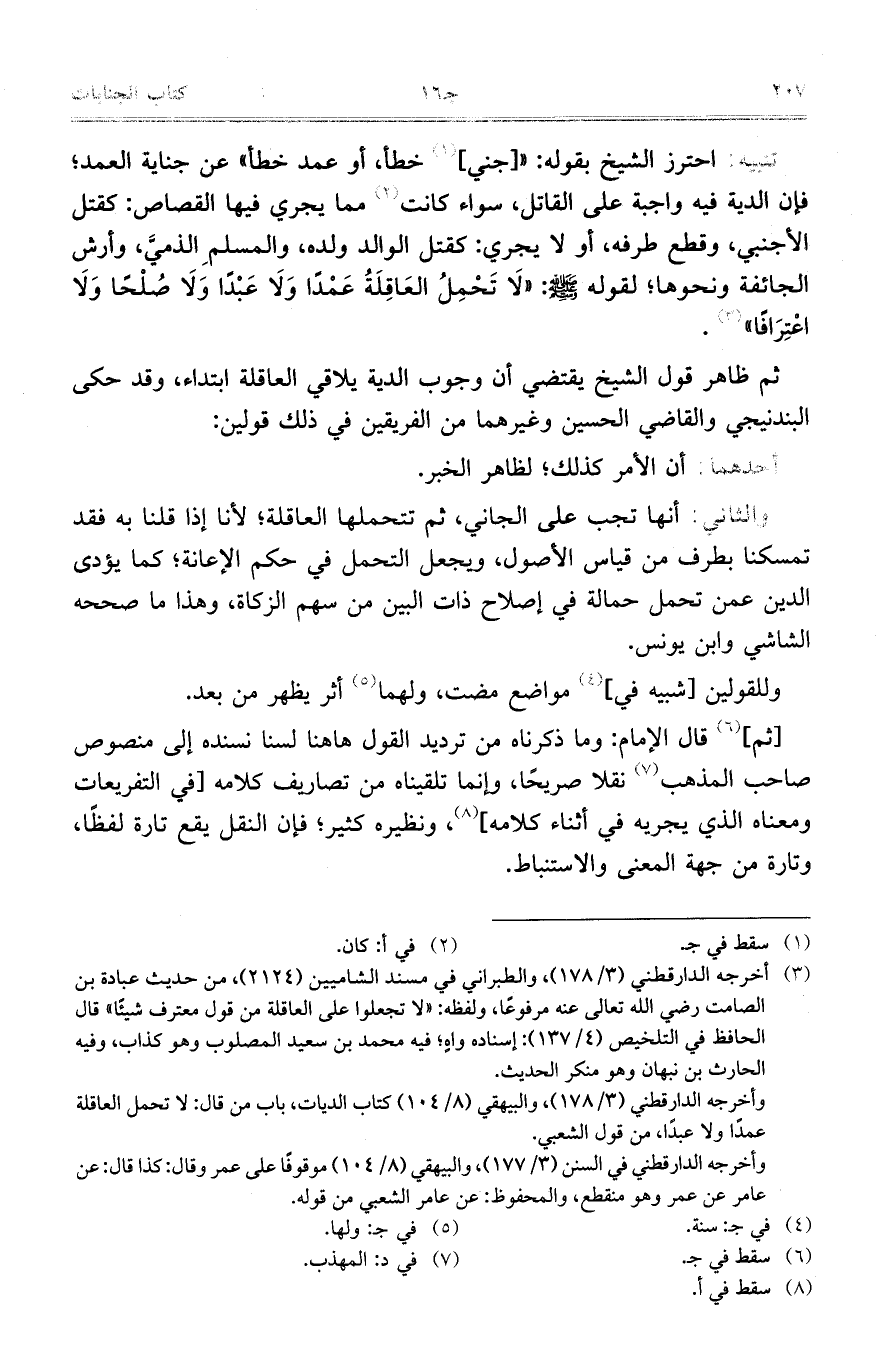 ثم ظاهر قول الشيخ يقتضي أن وجوب الدية يلاقي العاقلة ابتداءن وقد حكى البندنيجي والقاضي الحسين وغيرهما من الفريقين في ذلك قولين: