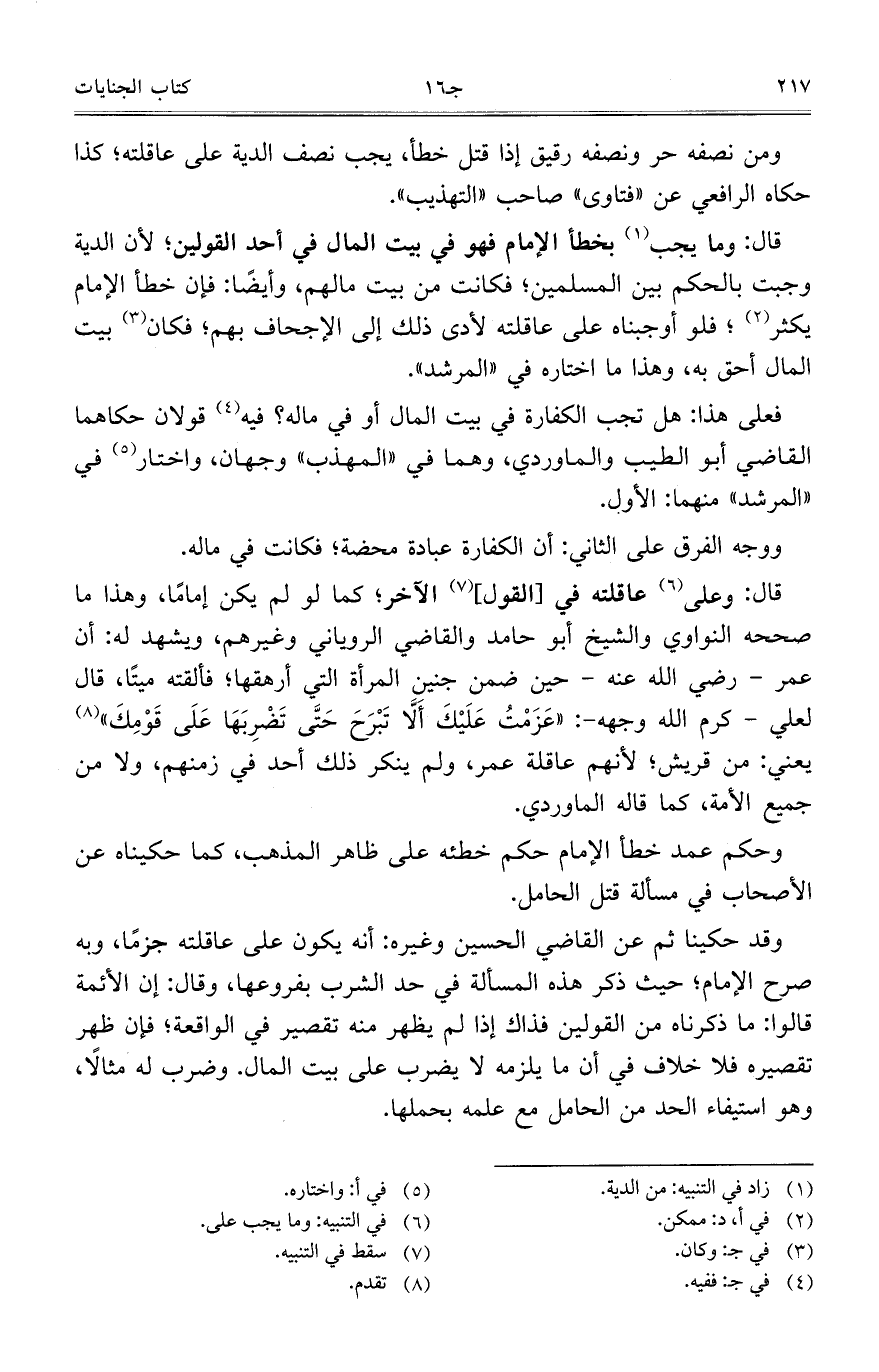 قال: وما يجب بخطأ الإمام فهو في بيت المال في أحد القولين؛ لأن الدية وجبت بالحكم بين المسلمين؛ فكانت من بيت مالهم، وأيضاً: فإن خطأ الإمام يكثر؛ فلوأوجبناه على عاقلته لأدى ذلك إلى الإجحاف بهم؛ فكان بيت المال احق بهن وهذا ما اختاره في "المرشد".