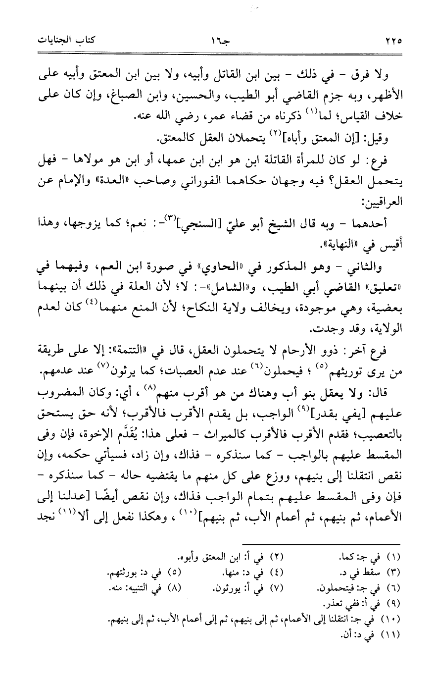 فرع: لو كان للمرأة القاتلة ابن هو ابن ابن عمها، أو ابن هو مولاها- فهل يتحمل العقل؟ فيه وجهان حكاهما الفوراني وصاحب "العدة" والإمام عن العراقيين: