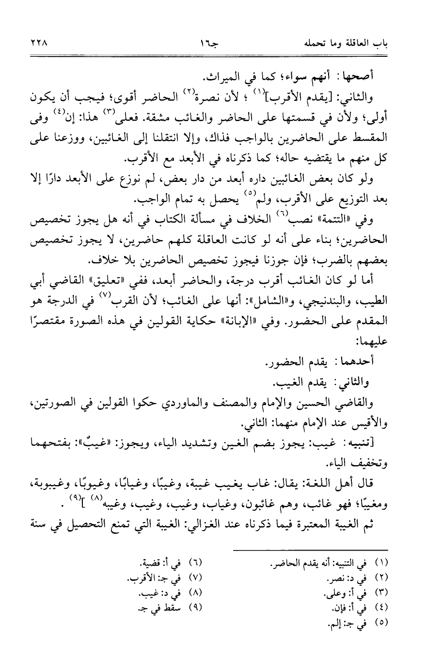 أما لو كان الغائب أقرب درجة، والحاضر أبعد، ففي "تعليق" القاضي أبي الطيب، والبندنيجي، و"الشامل": أنها على الغائب؛ لأن القرب في الدرجة هو المقدم على الحضور. وفي "الإبانة" حكاية القولين في هذه الصورة مقتصراً عليهما: