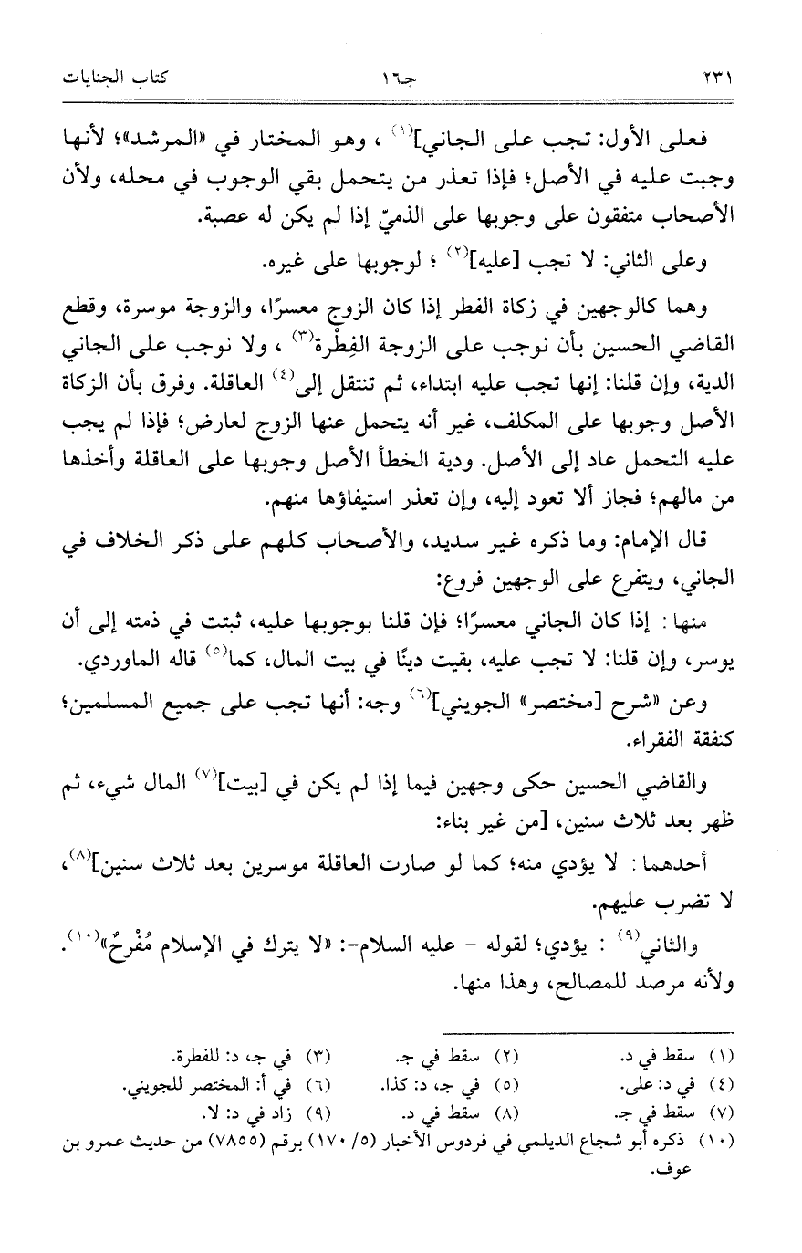 وهما كالوجهين في زكاة الفطر إذا كان الزوج معسراً، والزوجة موسرة، وقطع القاضي الحسين بأن نوجب على الزوجة الفِطْرة، ولا نوجب على الجاني الدية، وإن قلنا: إنها تجب عليه ابتداء، ثم تنتقل إلى العاقلة. وفرق بأن الزكاة الأصل وجوبها على المكلف، غيرأنه يتحمل عنها الزوج لعارض؛ فإذا لم يجب عليه التحمل عاد إلى الأصل. ودية الخطأ الأصل وجوبها على العاقلة وأخذها من مالهم؛ فجاز ألا تعود إليه، وإن تعذر استيفاؤها منهم.