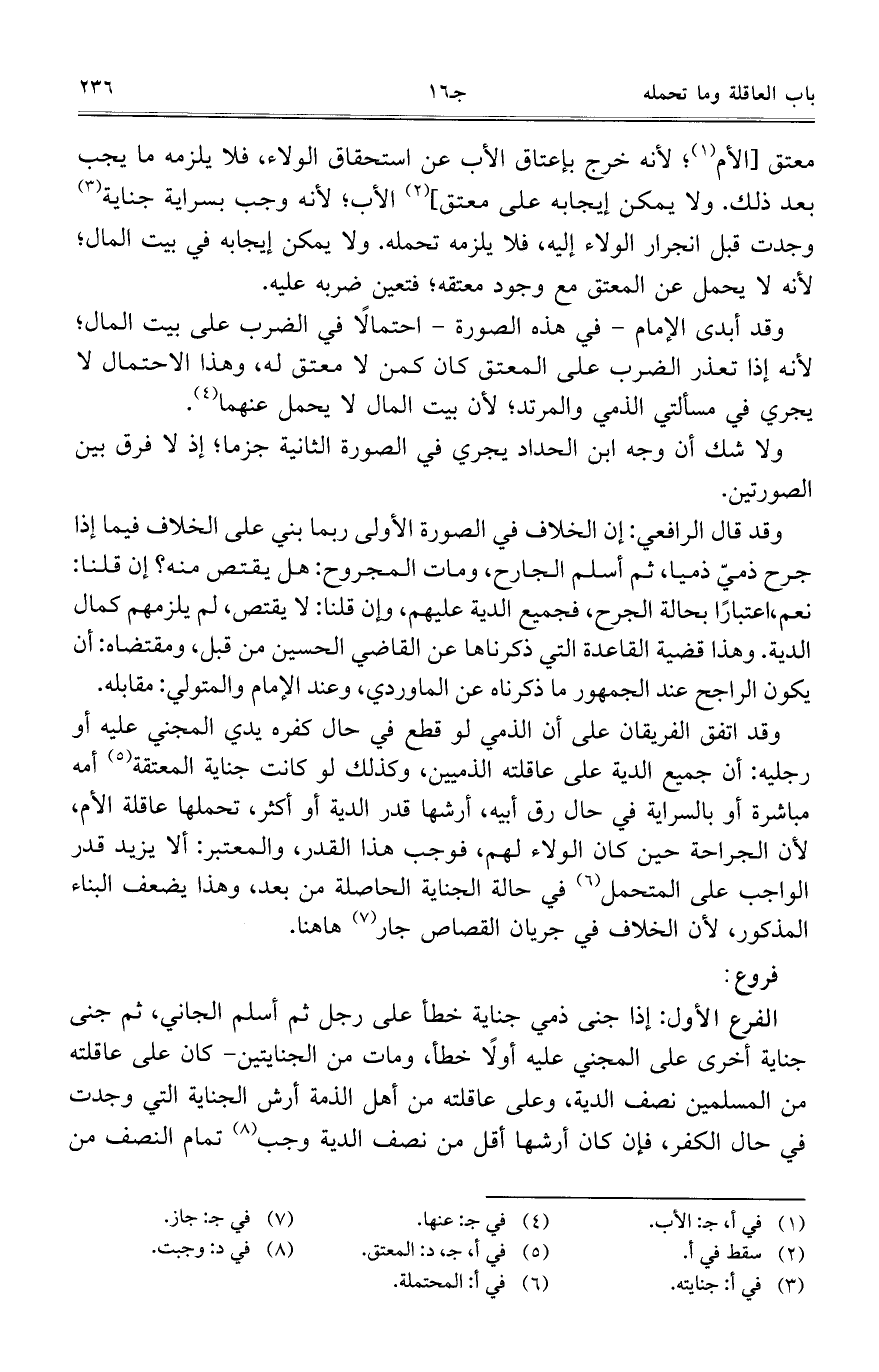 وقد اتفق الفريقان على أن الذمي لوقطع في حال كفره يدي المجني عليه أو رجليه: أن جميع الدية على عاقلته الذميين، وكذلك لو كانت جناية المعتقة أمه مباشرة أو بالسراية في حال رق أبيه، أرشها قدر الدية أو أكثر، تحملها عاقلة الأم، لأن الجراحة حين كان الولاء لهم، فوجب هذا القدر، والمعتبر: ألا يزيد قدر الواجب على المتحمل في حالة الجناية الحاصلة من بعد، وهذا يضعف البناء المذكور، لأن الخلاف في جريان القصاص جار هاهنا.