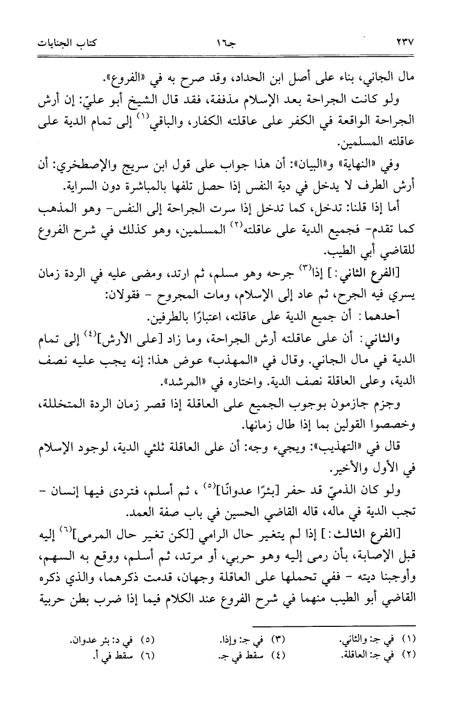 أما إذا قلنا: تدخل، كما تدخل إذا سرت الجراحة إلى النفس – وهو المذهب كما تقدم – فجميع الدية على عاقلته المسلمين، وهو كذلك في شرح الفروع للقاضي أبي الطيب.