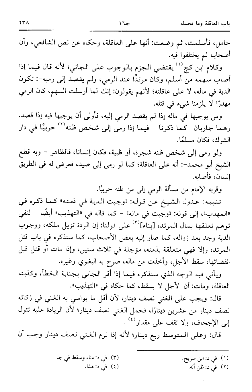 وكلام ابن كج يقتضي الجزم بالوجوب على الجاني؛ لانه قال فيما إذا أصاب سهمه من أسلم، وكان مرتداً عند الرمي، ولم يقصد إلى رميه -: تكون الدية في ماله، لا على عاقلته؛ لأنهم يقولون: إنك لما أرسلت السهم، كان الرمي مهدراً لا يلزمنا شيء في قتله.